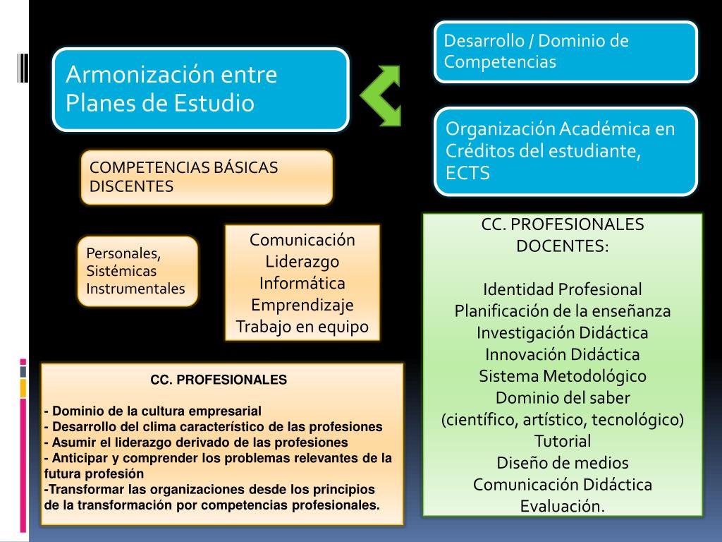 CC. PROFESIONALES DOCENTES: Identidad Profesional Planificación de la enseñanza Investigación Didáctica Innovación Didáctica Sistema Metodológico Dominio del saber (científico, artístico, tecnológico) Tutorial Diseño de medios Comunicación Didáctica Evaluación. Comunicación Liderazgo Informática Emprendizaje Trabajo en equipo CC. PROFESIONALES - Dominio de la cultura empresarial - Desarrollo del clima característico de las profesiones - Asumir el liderazgo derivado de las profesiones - Anticipar y comprender los problemas relevantes de la futura profesión -Transformar las organizaciones desde los principios de la transformación por competencias profesionales.