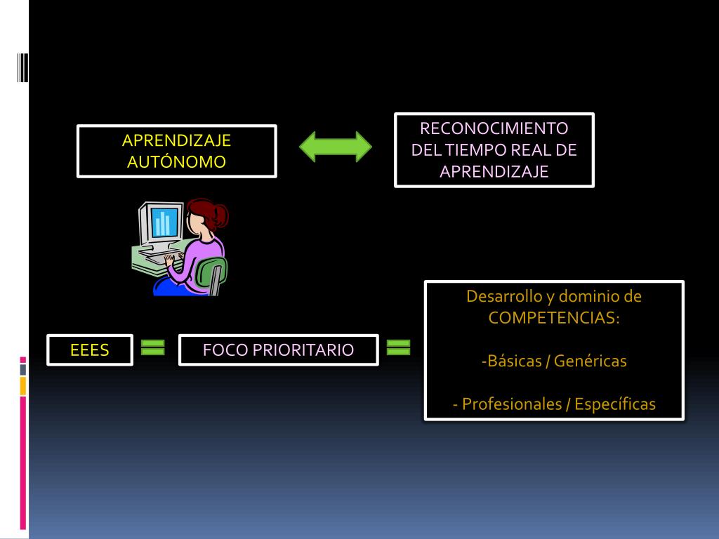 RECONOCIMIENTO DEL TIEMPO REAL DE APRENDIZAJE APRENDIZAJE AUTÓNOMO • Desarrollo y dominio de COMPETENCIAS: • Básicas / Genéricas • Profesionales / Específicas EEES FOCO PRIORITARIO