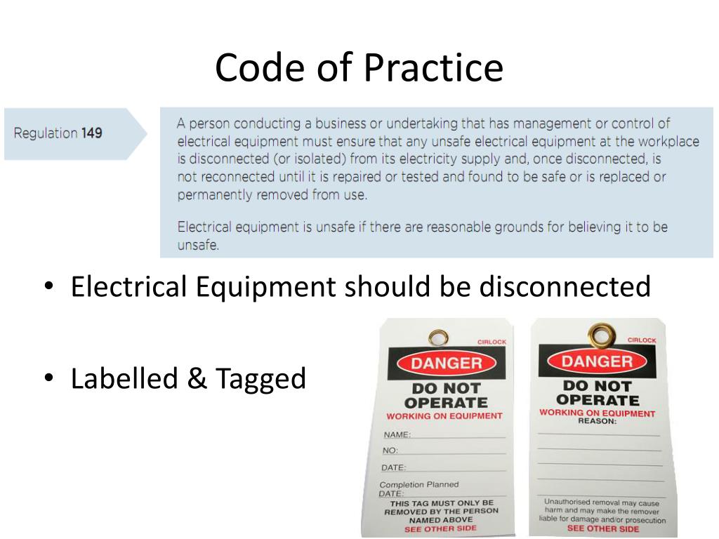 Code of Practice • Electrical Equipment should be disconnected • Labelled & Tagged