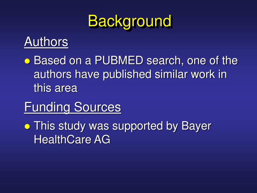 Background Authors • Based on a PUBMED search, one of the authors have published similar work in this area Funding Sources • This study was supported by Bayer HealthCare AG