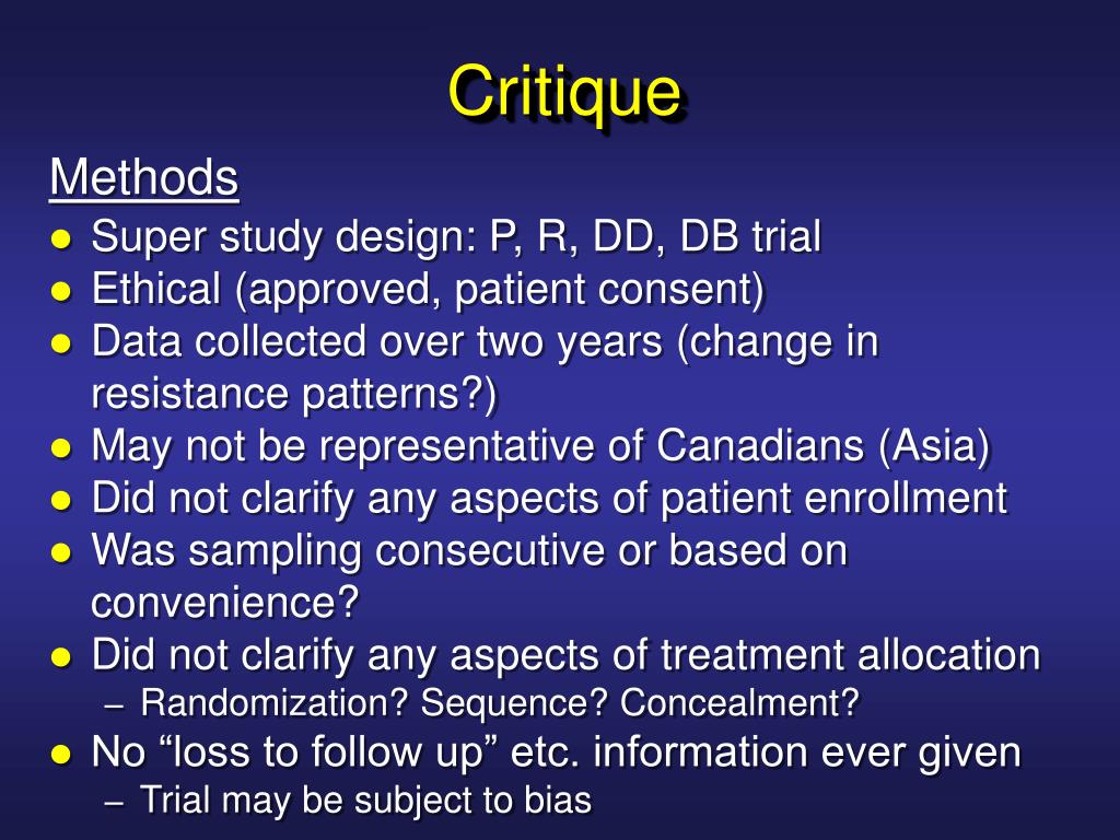 Critique Methods • Super study design: P, R, DD, DB trial • Ethical (approved, patient consent) • Data collected over two years (change in resistance patterns?) • May not be representative of Canadians (Asia) • Did not clarify any aspects of patient enrollment • Was sampling consecutive or based on convenience? • Did not clarify any aspects of treatment allocation • Randomization? Sequence? Concealment? • No “loss to follow up” etc. information ever given • Trial may be subject to bias