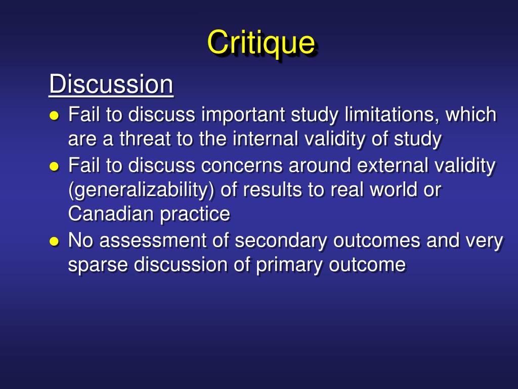 Critique Discussion • Fail to discuss important study limitations, which are a threat to the internal validity of study • Fail to discuss concerns around external validity (generalizability) of results to real world or Canadian practice • No assessment of secondary outcomes and very sparse discussion of primary outcome