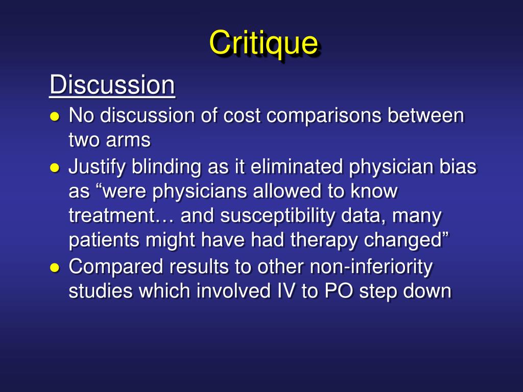 Critique Discussion • No discussion of cost comparisons between two arms • Justify blinding as it eliminated physician bias as “were physicians allowed to know treatment… and susceptibility data, many patients might have had therapy changed” • Compared results to other non-inferiority studies which involved IV to PO step down