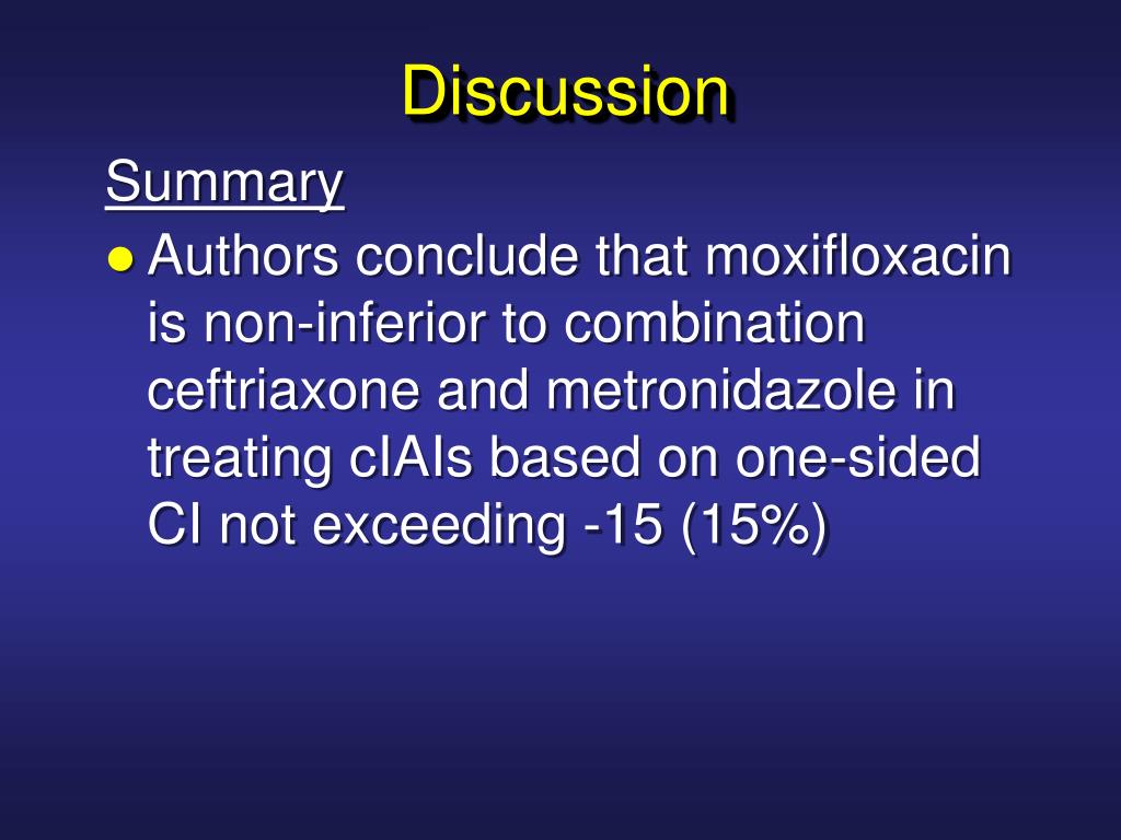 Discussion Summary • Authors conclude that moxifloxacin is non-inferior to combination ceftriaxone and metronidazole in treating cIAIs based on one-sided CI not exceeding -15 (15%)