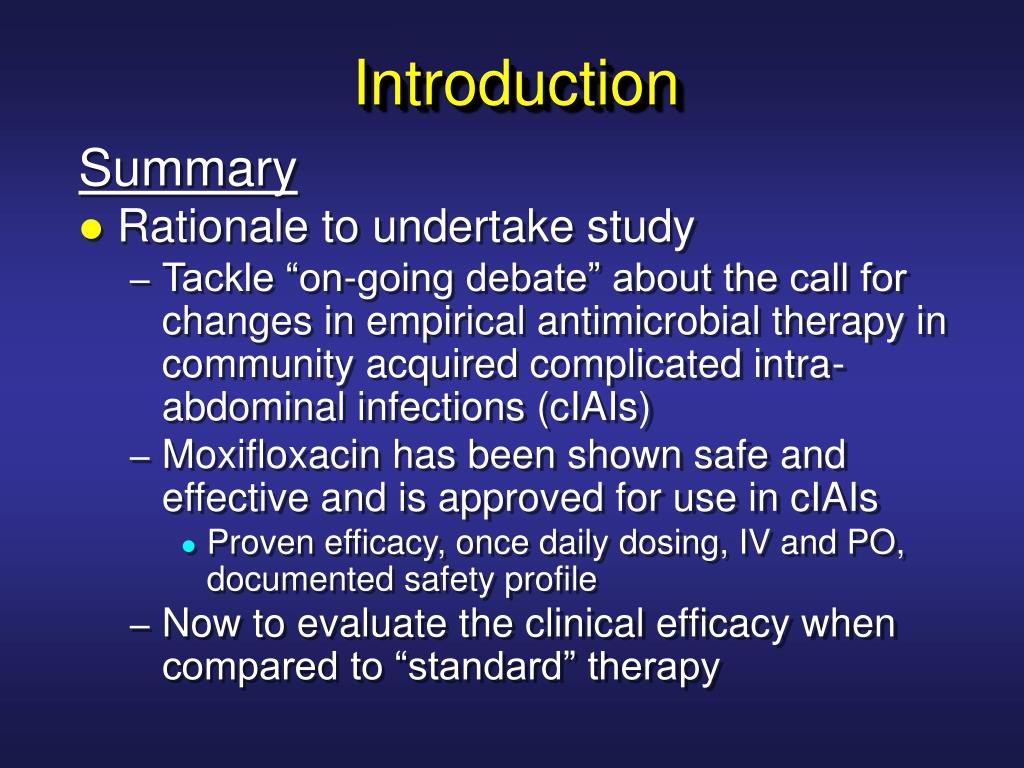 Introduction Summary • Rationale to undertake study • Tackle “on-going debate” about the call for changes in empirical antimicrobial therapy in community acquired complicated intra-abdominal infections (cIAIs) • Moxifloxacin has been shown safe and effective and is approved for use in cIAIs • Proven efficacy, once daily dosing, IV and PO, documented safety profile • Now to evaluate the clinical efficacy when compared to “standard” therapy