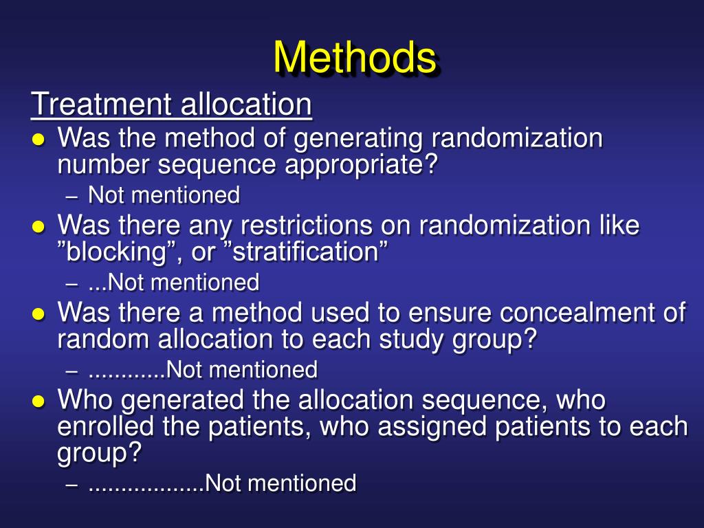 Methods Treatment allocation • Was the method of generating randomization number sequence appropriate? • Not mentioned • Was there any restrictions on randomization like ”blocking”, or ”stratification” • ...Not mentioned • Was there a method used to ensure concealment of random allocation to each study group? • ............Not mentioned • Who generated the allocation sequence, who enrolled the patients, who assigned patients to each group? • ..................Not mentioned