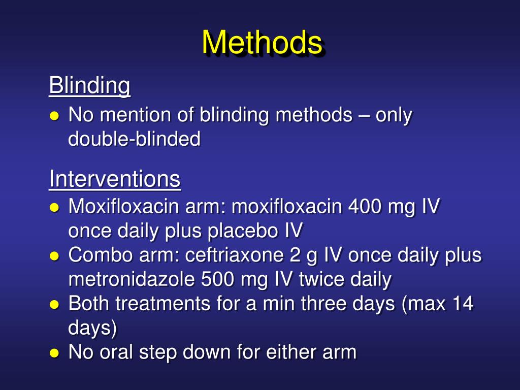 Methods Blinding • No mention of blinding methods – only double-blinded Interventions • Moxifloxacin arm: moxifloxacin 400 mg IV once daily plus placebo IV • Combo arm: ceftriaxone 2 g IV once daily plus metronidazole 500 mg IV twice daily • Both treatments for a min three days (max 14 days) • No oral step down for either arm