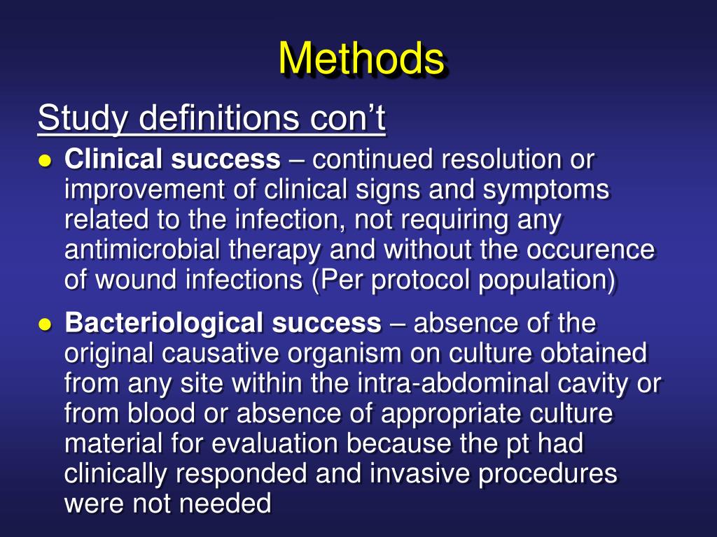 Methods Study definitions con’t • Clinical success – continued resolution or improvement of clinical signs and symptoms related to the infection, not requiring any antimicrobial therapy and without the occurence of wound infections (Per protocol population) • Bacteriological success – absence of the original causative organism on culture obtained from any site within the intra-abdominal cavity or from blood or absence of appropriate culture material for evaluation because the pt had clinically responded and invasive procedures were not needed