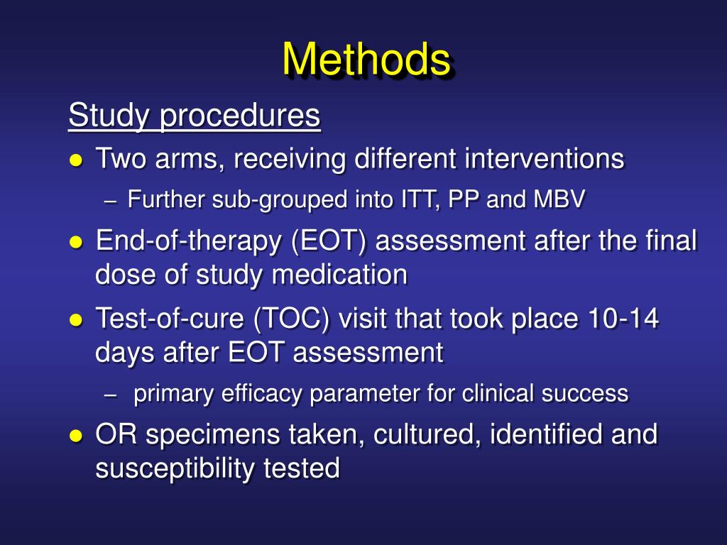 Methods Study procedures • Two arms, receiving different interventions • Further sub-grouped into ITT, PP and MBV • End-of-therapy (EOT) assessment after the final dose of study medication • Test-of-cure (TOC) visit that took place 10-14 days after EOT assessment • primary efficacy parameter for clinical success • OR specimens taken, cultured, identified and susceptibility tested