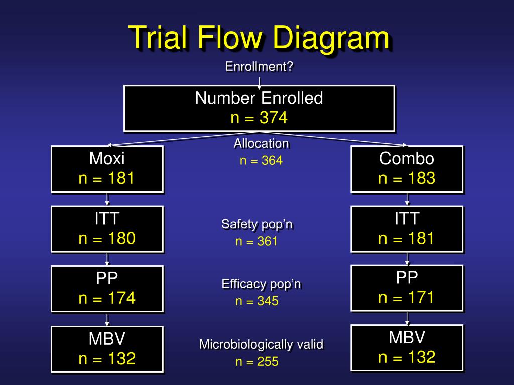 Trial Flow Diagram Enrollment? Number Enrolled n = 374 Allocation Moxi n = 181 Combo n = 183 n = 364 13% not included in final analysis ITT n = 180 ITT n = 181 Safety pop’n n = 361 PP n = 171 PP n = 174 Efficacy pop’n n = 345 MBV n = 132 MBV n = 132 Microbiologically valid n = 255