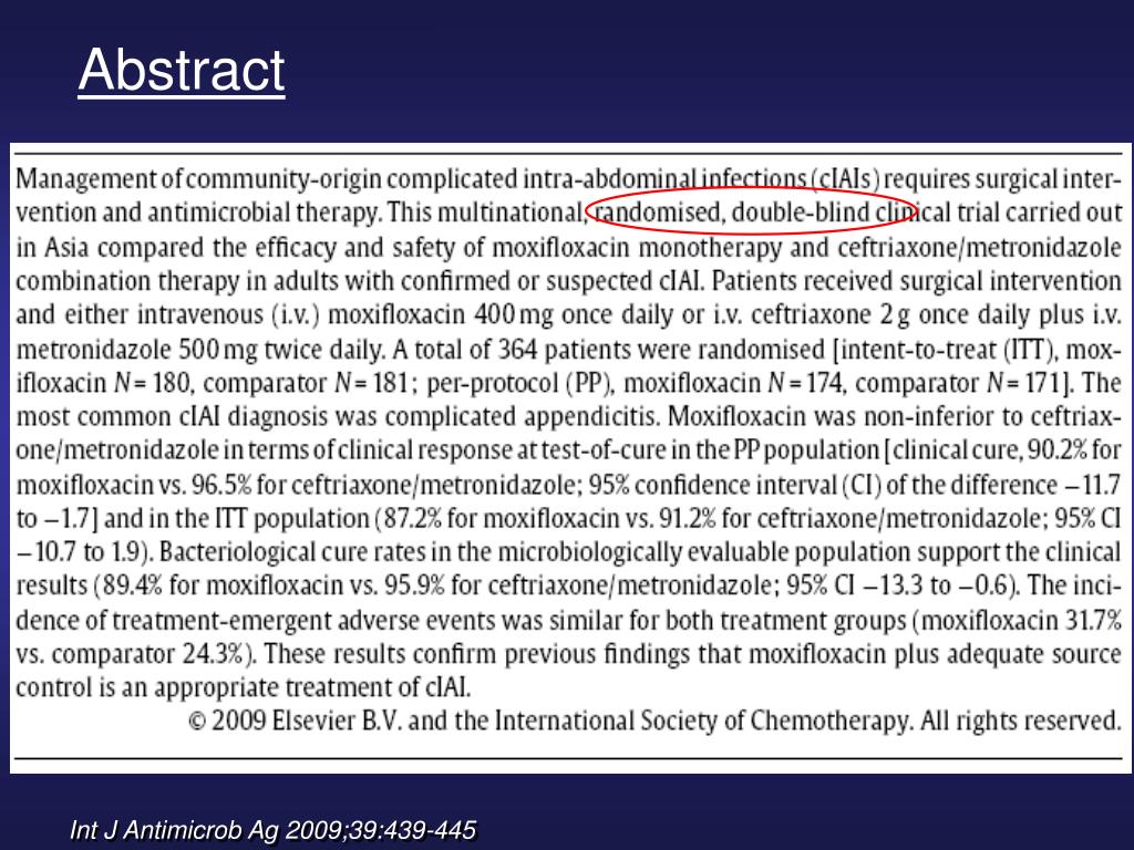 Introduction Purpose “The current study was conducted to evaluate the clinical efficacy of moxifloxacin in usually non-life threatening infections… with that of a standard combination regimen of ceftriaxone plus metronidazole in patients with cIAI.” Int J Antimicrob Ag 2009;39:439-445
