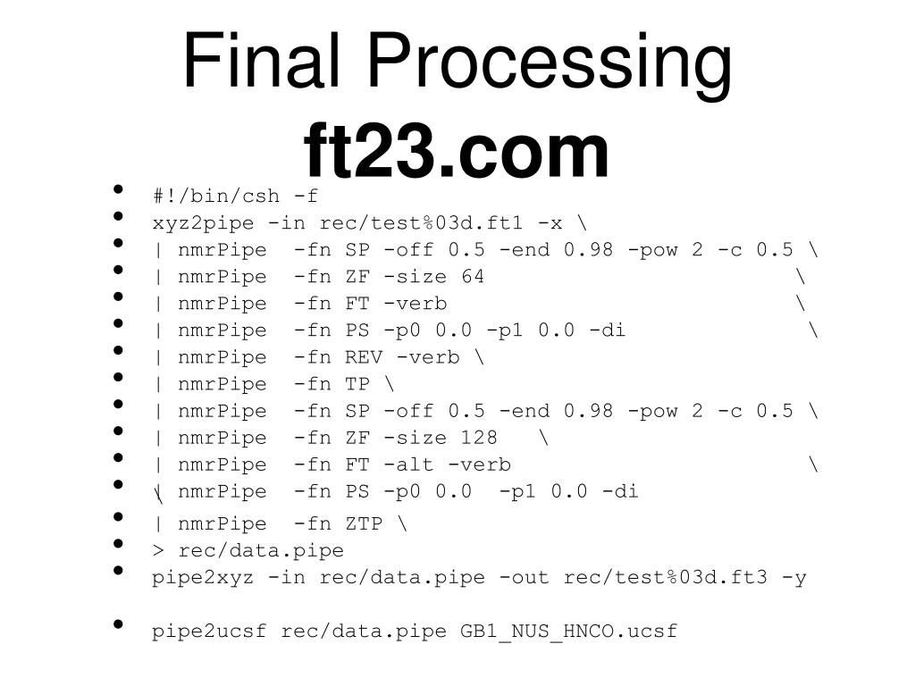 Final Processingft23.com • #!/bin/csh -f • xyz2pipe -in rec/test%03d.ft1 -x \ • | nmrPipe -fn SP -off 0.5 -end 0.98 -pow 2 -c 0.5 \ • | nmrPipe -fn ZF -size 64 \ • | nmrPipe -fn FT -verb \ • | nmrPipe -fn PS -p0 0.0 -p1 0.0 -di \ • | nmrPipe -fn REV -verb \ • | nmrPipe -fn TP \ • | nmrPipe -fn SP -off 0.5 -end 0.98 -pow 2 -c 0.5 \ • | nmrPipe -fn ZF -size 128 \ • | nmrPipe -fn FT -alt -verb \ • | nmrPipe -fn PS -p0 0.0 -p1 0.0 -di \ • | nmrPipe -fn ZTP \ • > rec/data.pipe • pipe2xyz -in rec/data.pipe -out rec/test%03d.ft3 -y • pipe2ucsf rec/data.pipe GB1_NUS_HNCO.ucsf