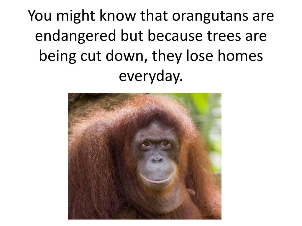 You might know that orangutans are endangered but because trees are being cut down, they lose homes everyday.