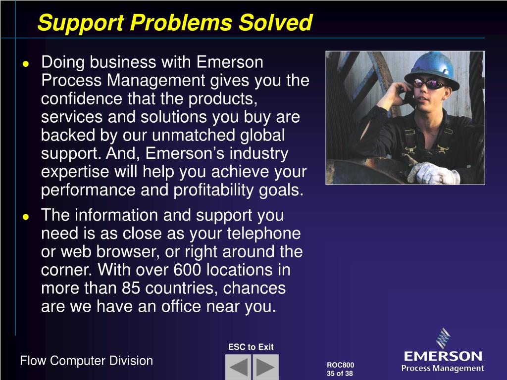 Support Problems Solved • Doing business with Emerson Process Management gives you the confidence that the products, services and solutions you buy are backed by our unmatched global support. And, Emerson’s industry expertise will help you achieve your performance and profitability goals. • The information and support you need is as close as your telephone or web browser, or right around the corner. With over 600 locations in more than 85 countries, chances are we have an office near you.