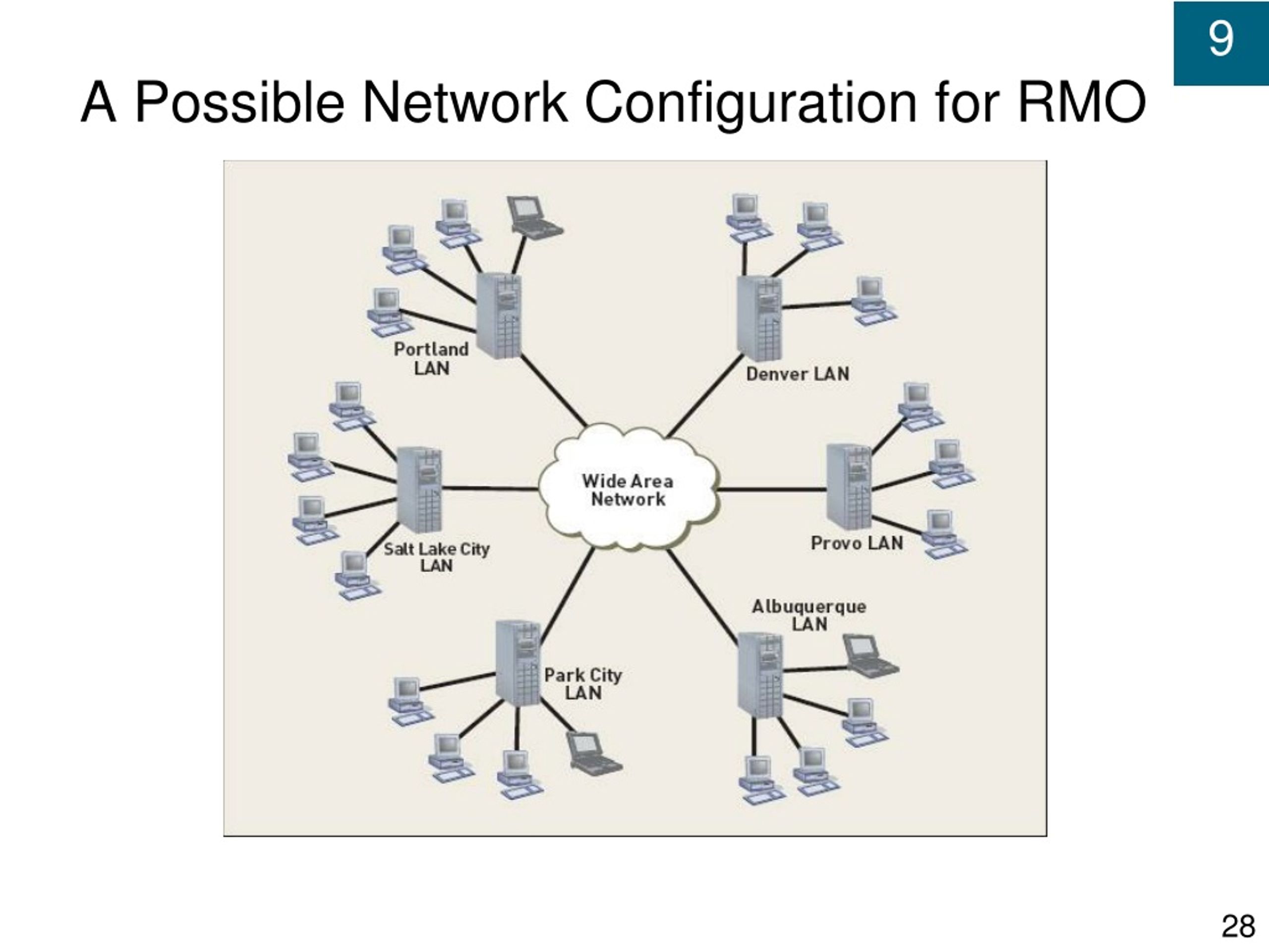 Computer Networks • Set of transmission lines, specialized hardware, and communication protocols • Enables communication among different users and computer systems • Local area network (LAN) less than one kilometer long – connects computers within single building • Wide area network (WAN) over one kilometer long – implies much greater, global, distances • Router – directs information within network