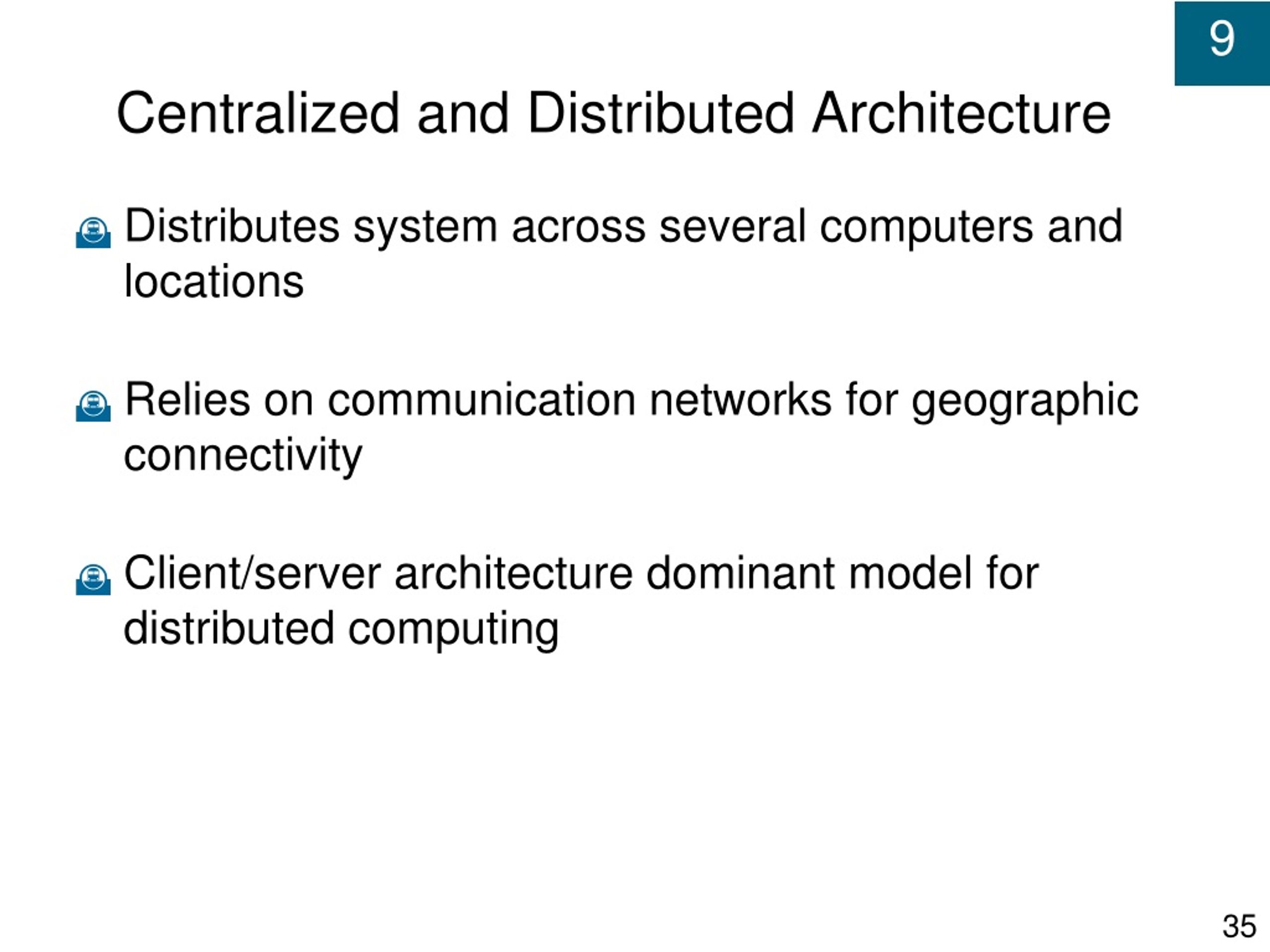 Centralized and Distributed Architecture • Distributes system across several computers and locations • Relies on communication networks for geographic connectivity • Client/server architecture dominant model for distributed computing