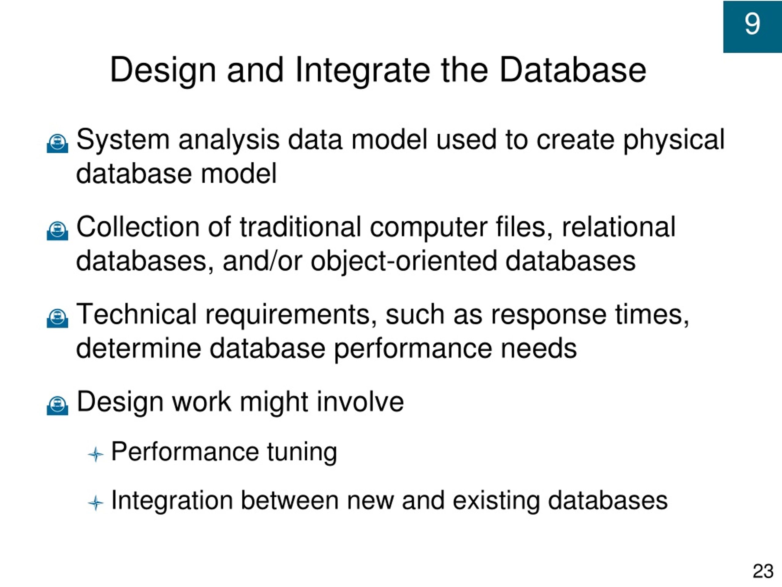 Design and Integrate the Database • System analysis data model used to create physical database model • Collection of traditional computer files, relational databases, and/or object-oriented databases • Technical requirements, such as response times, determine database performance needs • Design work might involve • Performance tuning • Integration between new and existing databases
