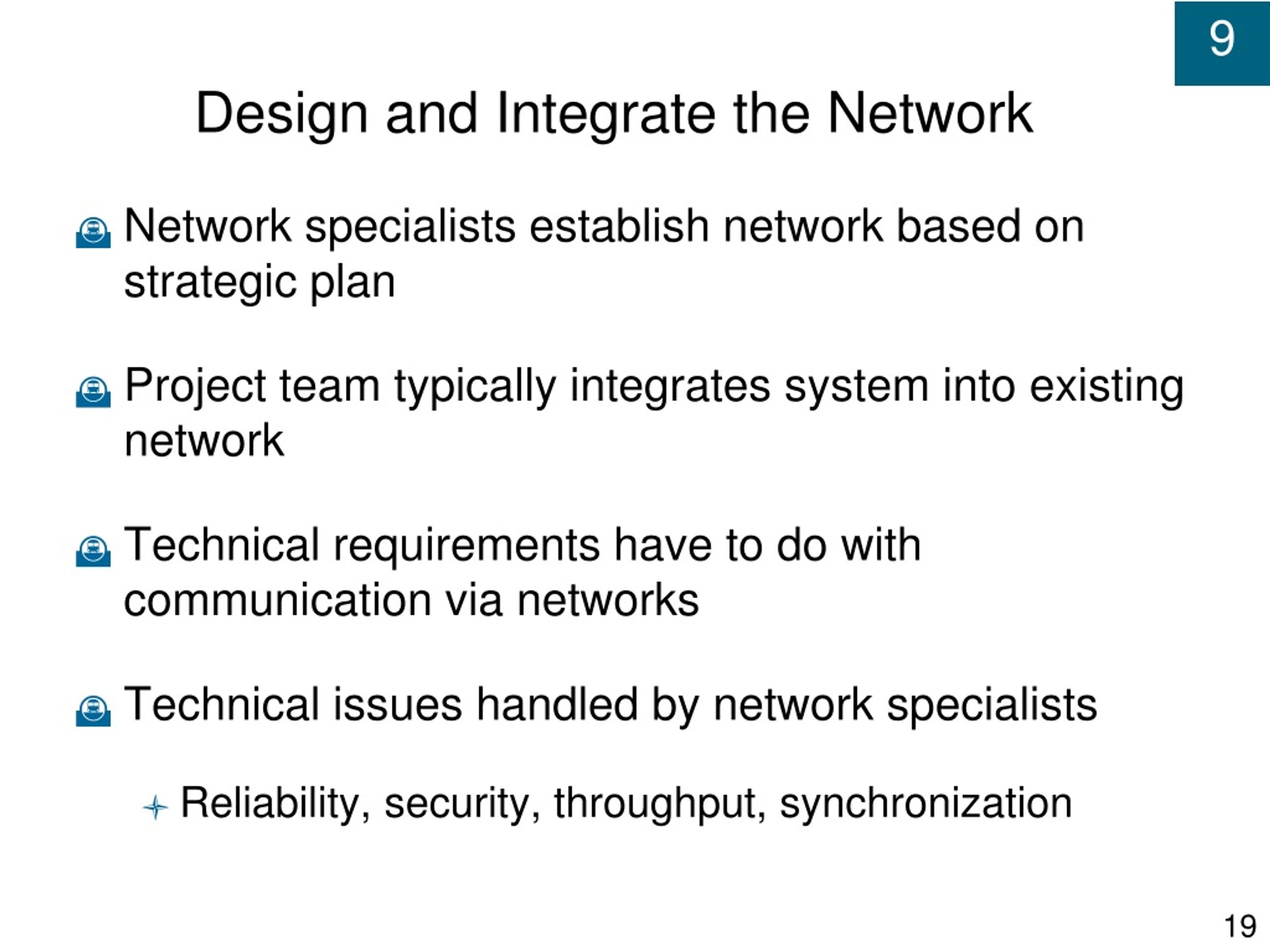 Design and Integrate the Network • Network specialists establish network based on strategic plan • Project team typically integrates system into existing network • Technical requirements have to do with communication via networks • Technical issues handled by network specialists • Reliability, security, throughput, synchronization