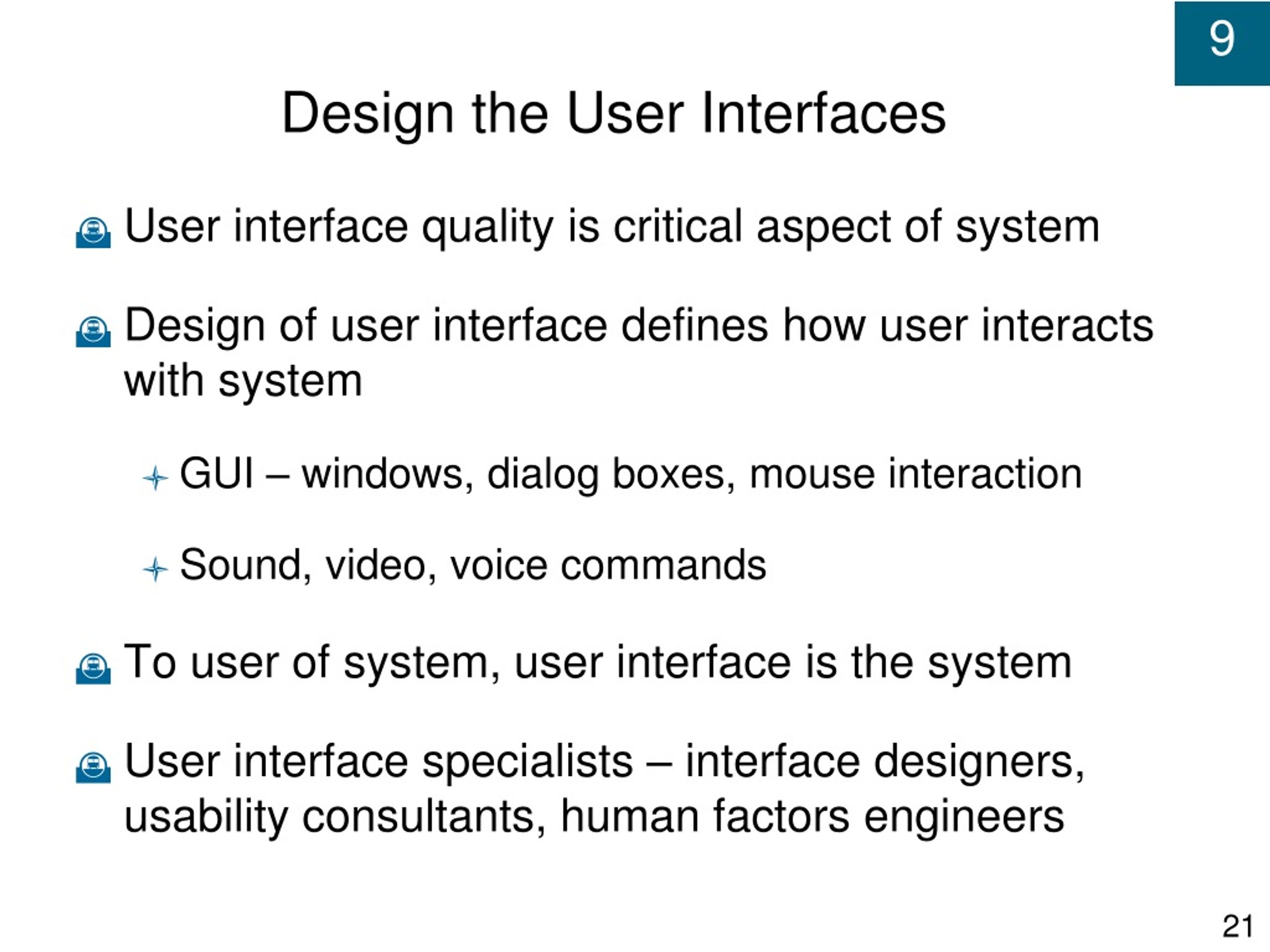 Design the User Interfaces • User interface quality is critical aspect of system • Design of user interface defines how user interacts with system • GUI – windows, dialog boxes, mouse interaction • Sound, video, voice commands • To user of system, user interface is the system • User interface specialists – interface designers, usability consultants, human factors engineers
