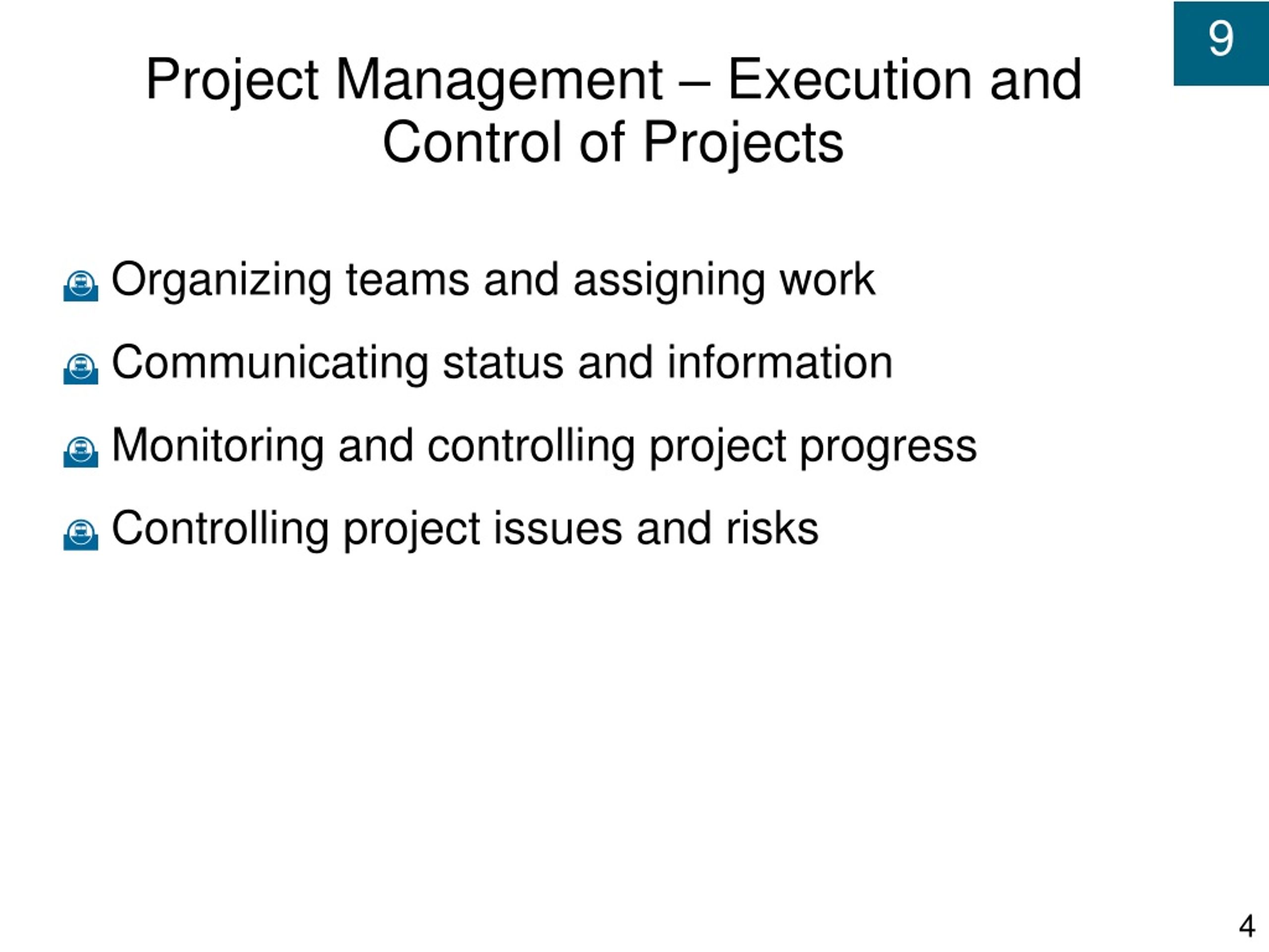 Project Management – Execution and Control of Projects • Organizing teams and assigning work • Communicating status and information • Monitoring and controlling project progress • Controlling project issues and risks