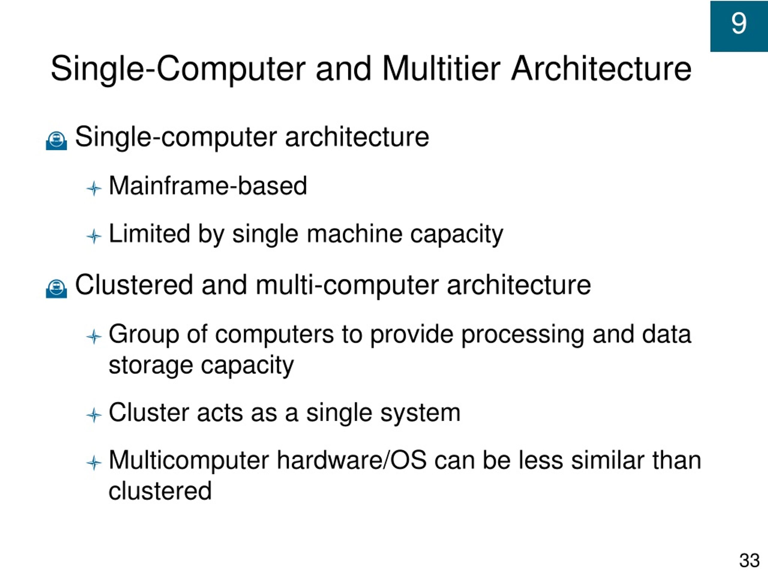 Single-Computer and Multitier Architecture • Single-computer architecture • Mainframe-based • Limited by single machine capacity • Clustered and multi-computer architecture • Group of computers to provide processing and data storage capacity • Cluster acts as a single system • Multicomputer hardware/OS can be less similar than clustered