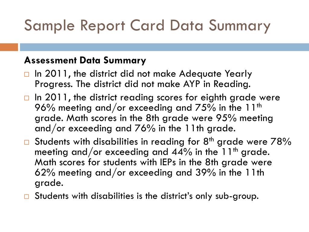 Sample Report Card Data Summary Assessment Data Summary • In 2011, the district did not make Adequate Yearly Progress. The district did not make AYP in Reading. • In 2011, the district reading scores for eighth grade were 96% meeting and/or exceeding and 75% in the 11th grade. Math scores in the 8th grade were 95% meeting and/or exceeding and 76% in the 11th grade. • Students with disabilities in reading for 8th grade were 78% meeting and/or exceeding and 44% in the 11th grade. Math scores for students with IEPs in the 8th grade were 62% meeting and/or exceeding and 39% in the 11th grade. • Students with disabilities is the district’s only sub-group.