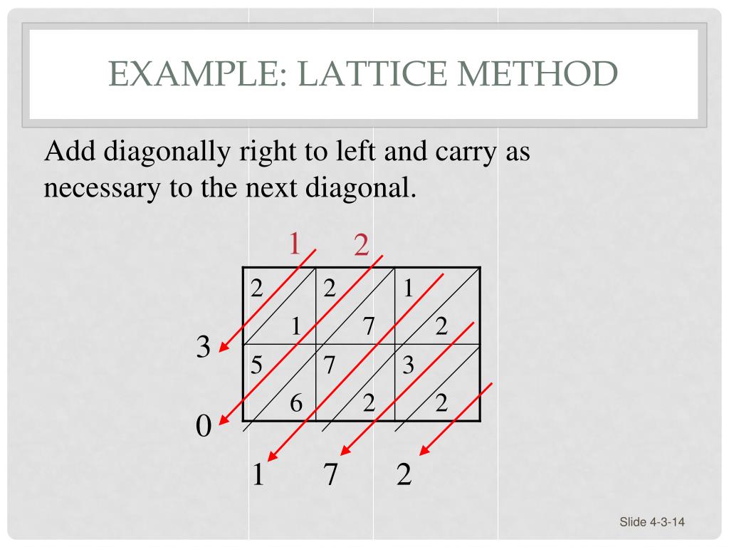 Example: Lattice Method Add diagonally right to left and carry as necessary to the next diagonal. 1 2 3 0 1 7 2