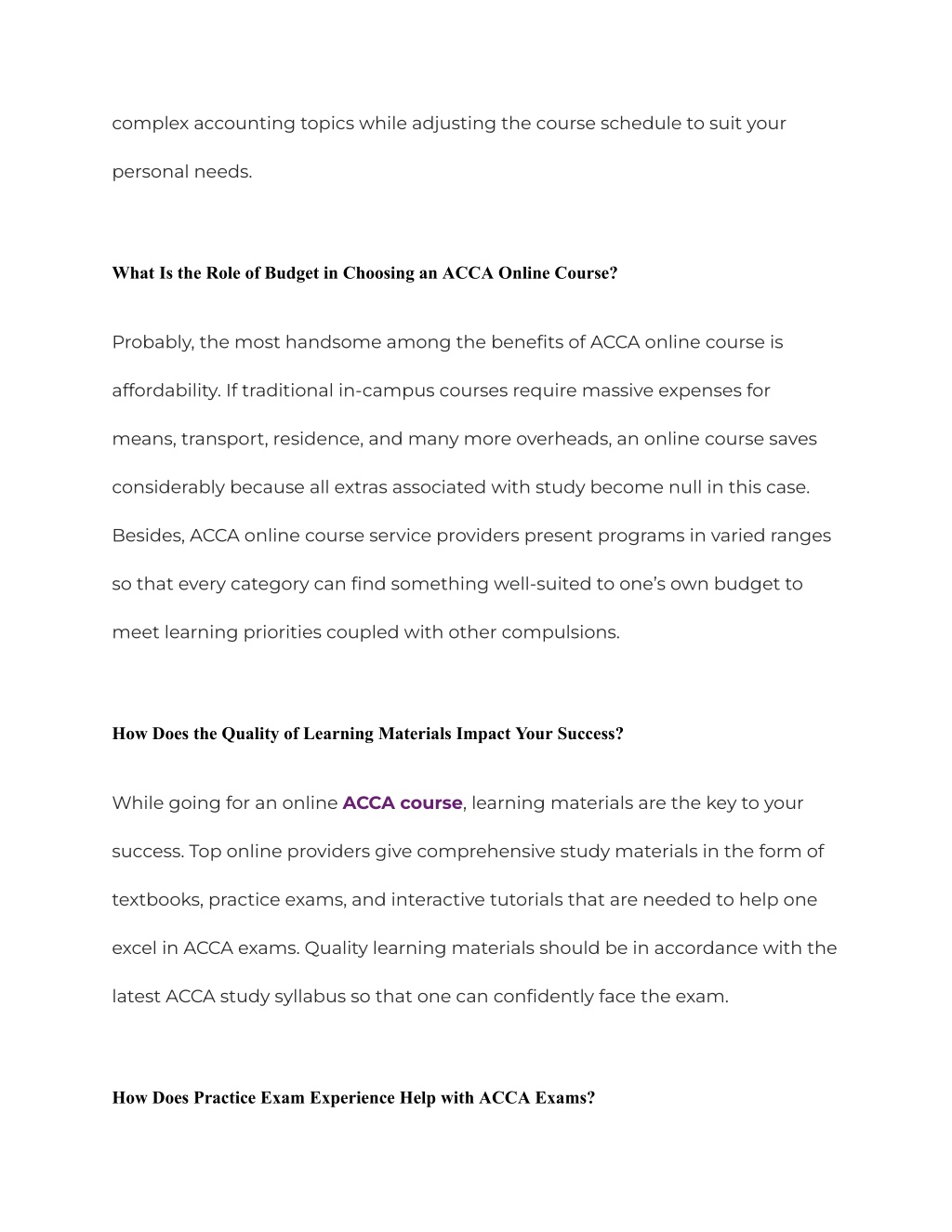 complex accounting topics while adjusting the course schedule to suit your personal needs. What Is the Role of Budget in Choosing an ACCA Online Course? Probably, the most handsome among the benefits of ACCA online courseis affordability. If traditional in-campus courses require massive expenses for means, transport, residence, and many more overheads, an online course saves considerably because all extras associated with study become null in this case. Besides, ACCA online course service providers present programs in varied ranges so that every category can find something well-suited to one’s own budget to meet learning priorities coupled with other compulsions. How Does the Quality of Learning Materials Impact Your Success? While going for an online ACCA course, learning materials are the key to your success. Top online providers give comprehensive study materials in the form of textbooks, practice exams, and interactive tutorials that are needed to help one excel in ACCA exams. Quality learning materials should be in accordance with the latest ACCA study syllabus so that one can confidently face the exam. How Does Practice Exam Experience Help with ACCA Exams?