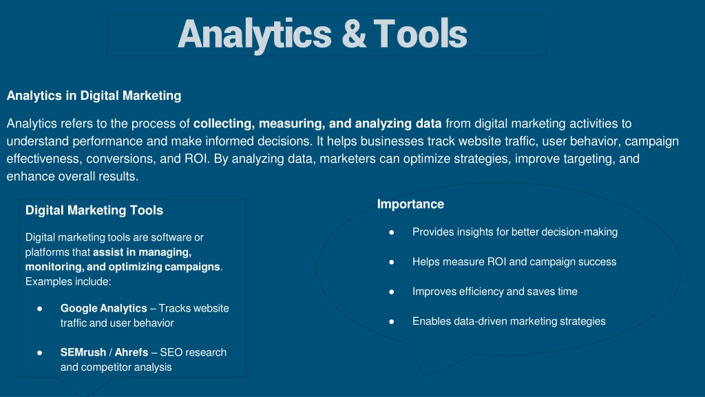 Analytics&Tools AnalyticsinDigitalMarketing Analyticsreferstotheprocessofcollecting,measuring,andanalyzingdata fromdigitalmarketingactivitiesto understandperformanceandmakeinformeddecisions.Ithelpsbusinessestrackwebsitetraffic,userbehavior,campaign effectiveness,conversions,andROI.Byanalyzingdata,marketerscanoptimizestrategies,improvetargeting,and enhanceoverallresults. • Importance • Providesinsightsforbetterdecision-making • HelpsmeasureROIandcampaignsuccess • Improvesefficiencyandsavestime • Enablesdata-drivenmarketingstrategies DigitalMarketingTools Digitalmarketingtoolsaresoftwareor platformsthatassistin managing, monitoring,andoptimizingcampaigns. Examplesinclude: • GoogleAnalytics–Trackswebsite trafficanduserbehavior • SEMrush/Ahrefs–SEOresearch andcompetitoranalysis