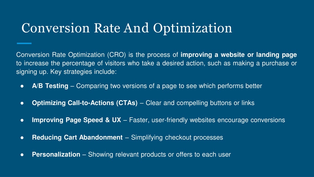 Conversion RateAndOptimization • ConversionRateOptimization(CRO)istheprocessofimprovingawebsiteorlandingpage toincreasethepercentageofvisitorswhotakeadesiredaction,suchasmakingapurchaseor signingup.Keystrategiesinclude: • A/BTesting–Comparingtwoversionsofapagetoseewhichperformsbetter • OptimizingCall-to-Actions(CTAs)–Clearandcompellingbuttonsorlinks • ImprovingPageSpeed&UX–Faster,user-friendlywebsitesencourageconversions • ReducingCartAbandonment–Simplifyingcheckoutprocesses • Personalization–Showingrelevantproductsorofferstoeachuser
