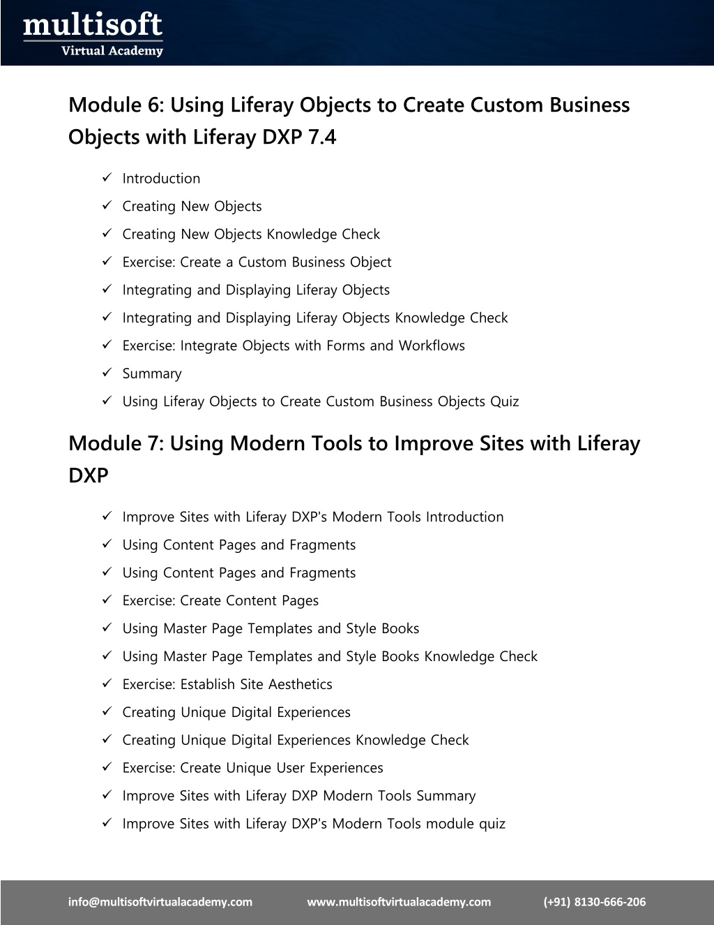 Module 6: Using Liferay Objects to Create Custom Business Objects with Liferay DXP 7.4 ✓Introduction ✓Creating New Objects ✓Creating New Objects Knowledge Check ✓Exercise: Create a Custom Business Object ✓Integrating and Displaying Liferay Objects ✓Integrating and Displaying Liferay Objects Knowledge Check ✓Exercise: Integrate Objects with Forms and Workflows ✓Summary ✓Using Liferay Objects to Create Custom Business Objects Quiz Module 7: Using Modern Tools to Improve Sites with Liferay DXP ✓Improve Sites with Liferay DXP's Modern Tools Introduction ✓Using Content Pages and Fragments ✓Using Content Pages and Fragments ✓Exercise: Create Content Pages ✓Using Master Page Templates and Style Books ✓Using Master Page Templates and Style Books Knowledge Check ✓Exercise: Establish Site Aesthetics ✓Creating Unique Digital Experiences ✓Creating Unique Digital Experiences Knowledge Check ✓Exercise: Create Unique User Experiences ✓Improve Sites with Liferay DXP Modern Tools Summary ✓Improve Sites with Liferay DXP's Modern Tools module quiz info@multisoftvirtualacademy.comwww.multisoftvirtualacademy.com (+91) 8130-666-206
