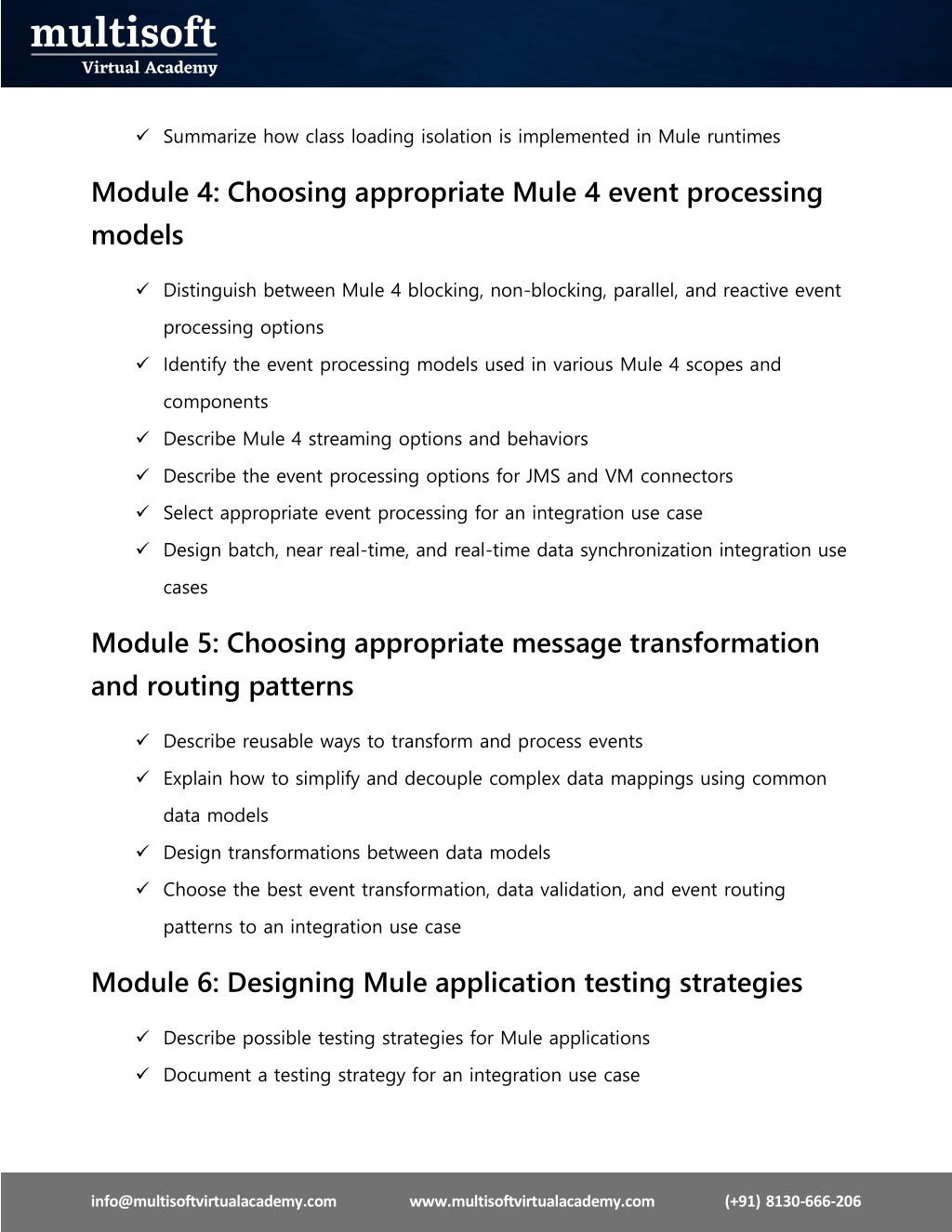 ✓Summarize how class loading isolation is implemented in Mule runtimes Module 4: Choosing appropriate Mule 4 event processing models ✓Distinguish between Mule 4 blocking, non-blocking, parallel, and reactive event processing options ✓Identify the event processing models used in various Mule 4 scopes and components ✓Describe Mule 4 streaming options and behaviors ✓Describe the event processing options for JMS and VM connectors ✓Select appropriate event processing for an integration use case ✓Design batch, near real-time, and real-time data synchronization integration use cases Module 5: Choosing appropriate message transformation and routing patterns ✓Describe reusable ways to transform and process events ✓Explain how to simplify and decouple complex data mappings using common data models ✓Design transformations between data models ✓Choose the best event transformation, data validation, and event routing patterns to an integration use case Module 6: Designing Mule application testing strategies ✓Describe possible testing strategies for Mule applications ✓Document a testing strategy for an integration use case info@multisoftvirtualacademy.comwww.multisoftvirtualacademy.com (+91) 8130-666-206