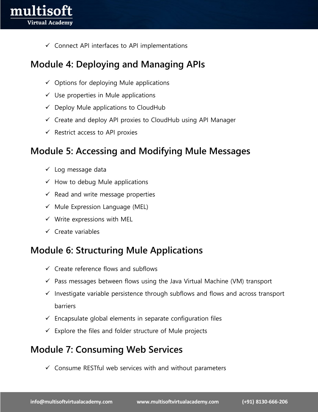 4. ✓Connect API interfaces to API implementations Module 4: Deploying and Managing APIs ✓Options for deploying Mule applications ✓Use properties in Mule applications ✓Deploy Mule applications to CloudHub ✓Create and deploy API proxies to CloudHub using API Manager ✓Restrict access to API proxies Module 5: Accessing and Modifying Mule Messages ✓Log message data ✓How to debug Mule applications ✓Read and write message properties ✓Mule Expression Language (MEL) ✓Write expressions with MEL ✓Create variables Module 6: Structuring Mule Applications ✓Create reference flows and subflows ✓Pass messages between flows using the Java Virtual Machine (VM) transport ✓Investigate variable persistence through subflows and flows and across transport barriers ✓Encapsulate global elements in separate configuration files ✓Explore the files and folder structure of Mule projects Module 7: Consuming Web Services ✓Consume RESTful web services with and without parameters info@multisoftvirtualacademy.comwww.multisoftvirtualacademy.com (+91) 8130-666-206