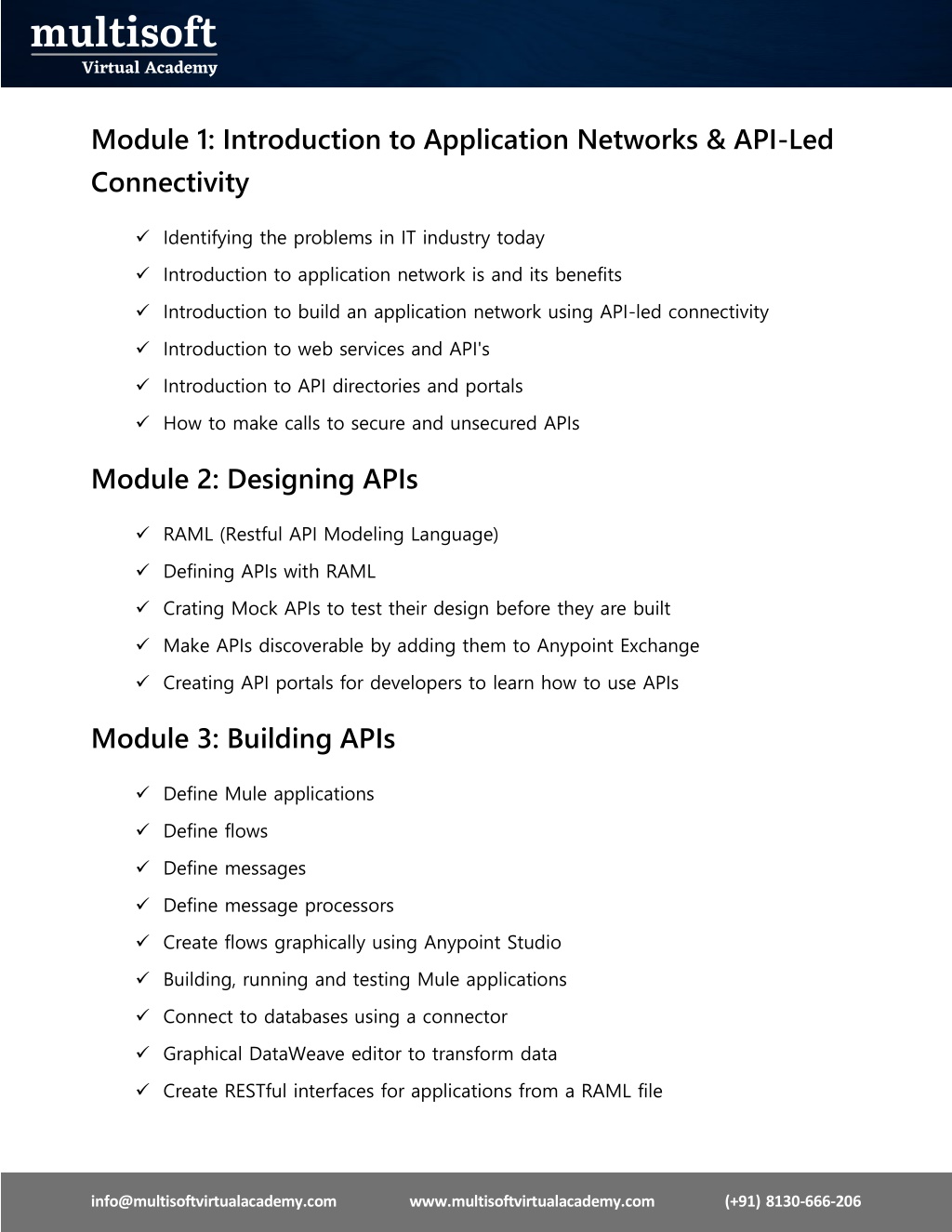 2. About Multisoft Take your skills to next level with Multisoft Virtual Academy, one of the leading certification training providers in the market. Collaborating with top technology companies, we offer world-class one-on-one and corporate trainings to empower professionals and businesses around the world. Delivering high-quality trainings through Multisoft’s global subject matter experts, we offer more than 1500 courses in various domains. Multisoft offers tailored corporate training; project Based Training, comprehensive learning solution with lifetime e-learning access, after training support and globally recognized training certificates. About Course MuleSoft Training by Multisoft Virtual Academy is designed to equip professionals with comprehensive skills in API integration and application connectivity using the MuleSoft Anypoint Platform. This training empowers individuals to streamline business processes, enhance system integration, and enable seamless communication between applications. info@multisoftvirtualacademy.comwww.multisoftvirtualacademy.com (+91) 8130-666-206