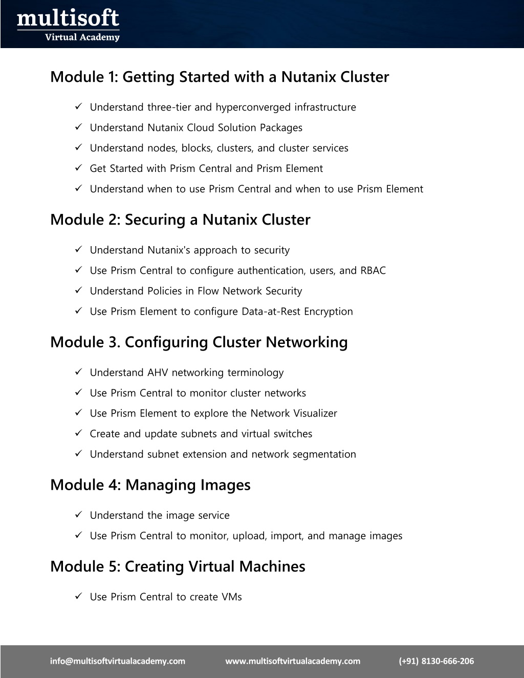 Module 1: Getting Started with a Nutanix Cluster ✓Understand three-tier and hyperconverged infrastructure ✓Understand Nutanix Cloud Solution Packages ✓Understand nodes, blocks, clusters, and cluster services ✓Get Started with Prism Central and Prism Element ✓Understand when to use Prism Central and when to use Prism Element Module 2: Securing a Nutanix Cluster ✓Understand Nutanix's approach to security ✓Use Prism Central to configure authentication, users, and RBAC ✓Understand Policies in Flow Network Security ✓Use Prism Element to configure Data-at-Rest Encryption Module 3. Configuring Cluster Networking ✓Understand AHV networking terminology ✓Use Prism Central to monitor cluster networks ✓Use Prism Element to explore the Network Visualizer ✓Create and update subnets and virtual switches ✓Understand subnet extension and network segmentation Module 4: Managing Images ✓Understand the image service ✓Use Prism Central to monitor, upload, import, and manage images Module 5: Creating Virtual Machines ✓Use Prism Central to create VMs info@multisoftvirtualacademy.comwww.multisoftvirtualacademy.com (+91) 8130-666-206