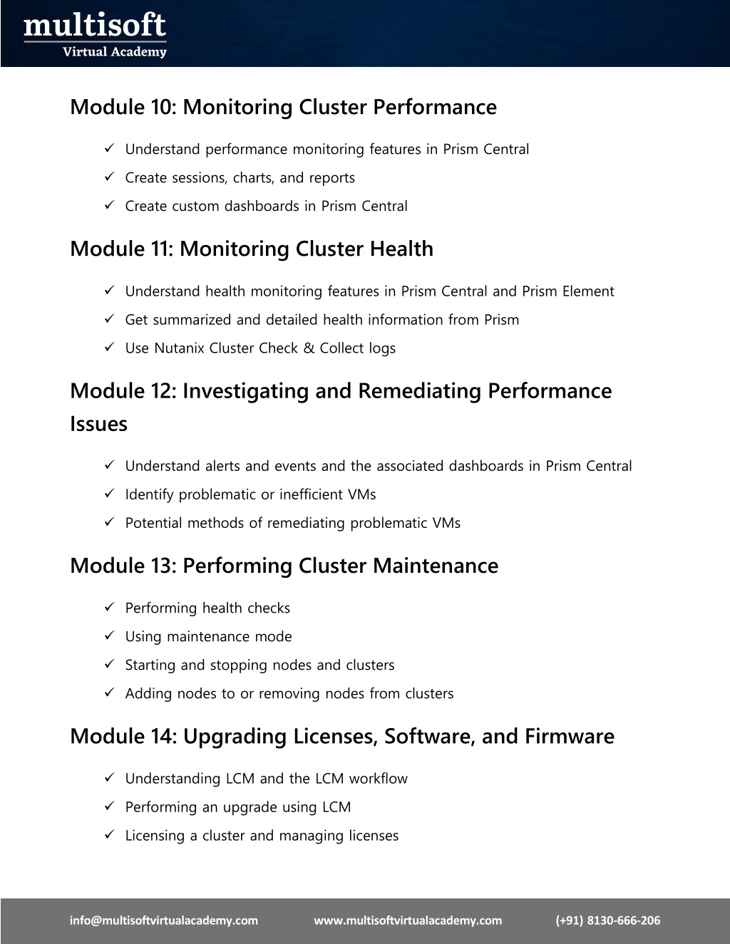 Module 10: Monitoring Cluster Performance ✓Understand performance monitoring features in Prism Central ✓Create sessions, charts, and reports ✓Create custom dashboards in Prism Central Module 11: Monitoring Cluster Health ✓Understand health monitoring features in Prism Central and Prism Element ✓Get summarized and detailed health information from Prism ✓Use Nutanix Cluster Check & Collect logs Module 12: Investigating and Remediating Performance Issues ✓Understand alerts and events and the associated dashboards in Prism Central ✓Identify problematic or inefficient VMs ✓Potential methods of remediating problematic VMs Module 13: Performing Cluster Maintenance ✓Performing health checks ✓Using maintenance mode ✓Starting and stopping nodes and clusters ✓Adding nodes to or removing nodes from clusters Module 14: Upgrading Licenses, Software, and Firmware ✓Understanding LCM and the LCM workflow ✓Performing an upgrade using LCM ✓Licensing a cluster and managing licenses info@multisoftvirtualacademy.comwww.multisoftvirtualacademy.com (+91) 8130-666-206