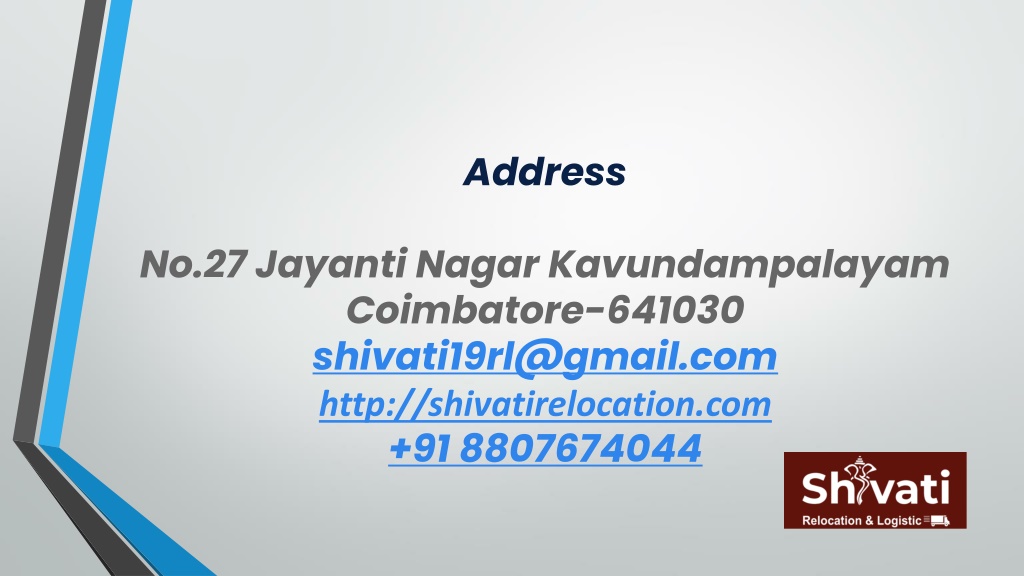 AddressNo.27 Jayanti Nagar Kavundampalayam Coimbatore-641030shivati19rl@gmail.comhttp://shivatirelocation.com+91 8807674044