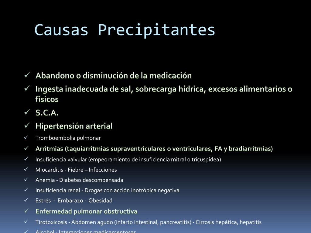 Causas Precipitantes • Abandono o disminución de la medicación • Ingesta inadecuada de sal, sobrecarga hídrica, excesos alimentarios o físicos • S.C.A. • Hipertensión arterial • Tromboembolia pulmonar • Arritmias (taquiarritmias supraventriculares o ventriculares, FA y bradiarritmias) • Insuficiencia valvular (empeoramiento de insuficiencia mitral o tricuspídea) • Miocarditis - Fiebre – Infecciones • Anemia - Diabetes descompensada • Insuficiencia renal - Drogas con acción inotrópica negativa • Estrés - Embarazo - Obesidad • Enfermedad pulmonar obstructiva • Tirotoxicosis - Abdomen agudo (infarto intestinal, pancreatitis) - Cirrosis hepática, hepatitis • Alcohol - Interacciones medicamentosas