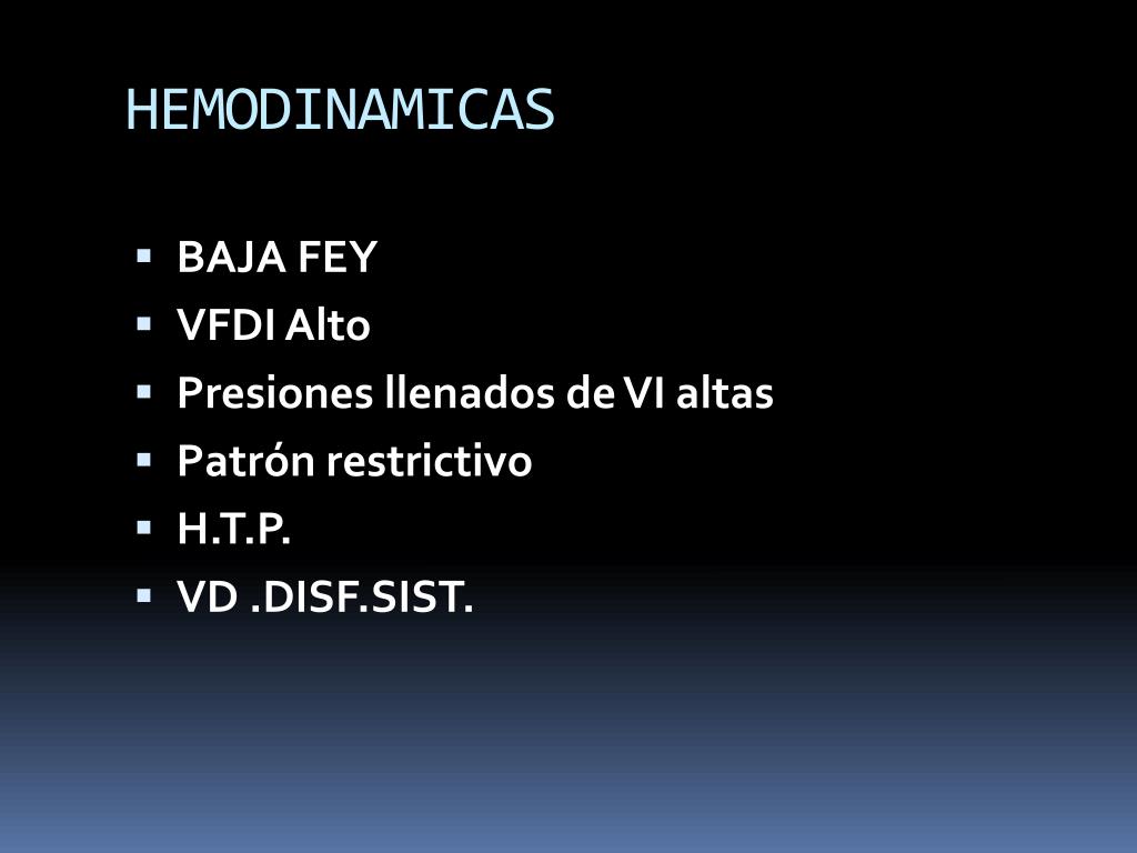 HEMODINAMICAS BAJA FEY VFDI Alto Presiones llenados de VI altas Patrón restrictivo H.T.P. VD .DISF.SIST.