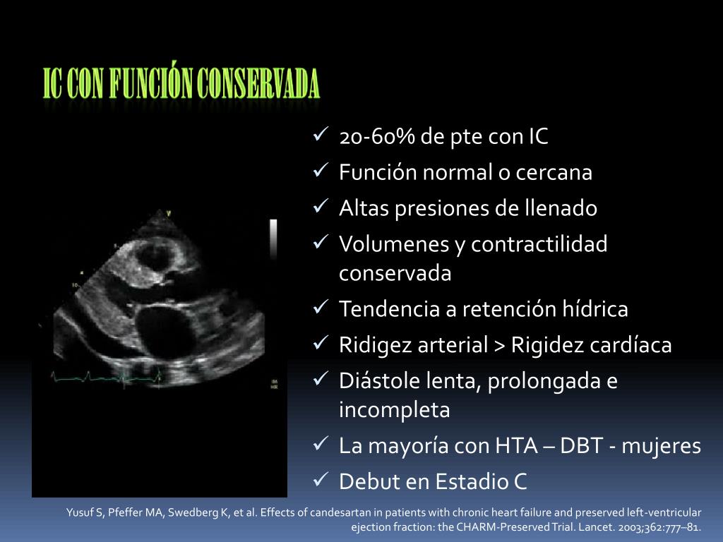 Yusuf S, Pfeffer MA, Swedberg K, et al. Effects of candesartan in patients with chronic heart failure and preserved left-ventricular ejection fraction: the CHARM-Preserved Trial. Lancet. 2003;362:777–81. • 20-60% de pte con IC • Función normal o cercana • Altas presiones de llenado • Volumenes y contractilidad conservada • Tendencia a retención hídrica • Ridigez arterial > Rigidez cardíaca • Diástole lenta, prolongada e incompleta • La mayoría con HTA – DBT - mujeres • Debut en Estadio C