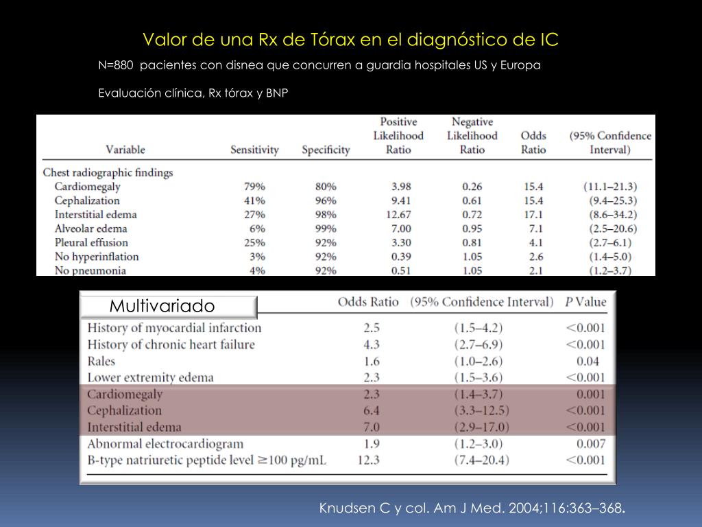 Valor de una Rx de Tórax en el diagnóstico de IC N=880 pacientes con disnea que concurren a guardia hospitales US y Europa Evaluación clínica, Rx tórax y BNP Multivariado Knudsen C y col. Am J Med. 2004;116:363–368.