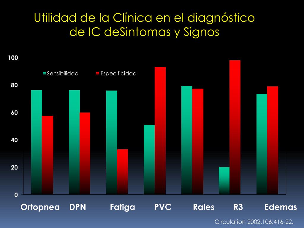Ortopnea DPN Fatiga PVC Rales R3 Edemas Utilidad de la Clínica en el diagnóstico de IC deSintomas y Signos Circulation 2002,106:416-22.