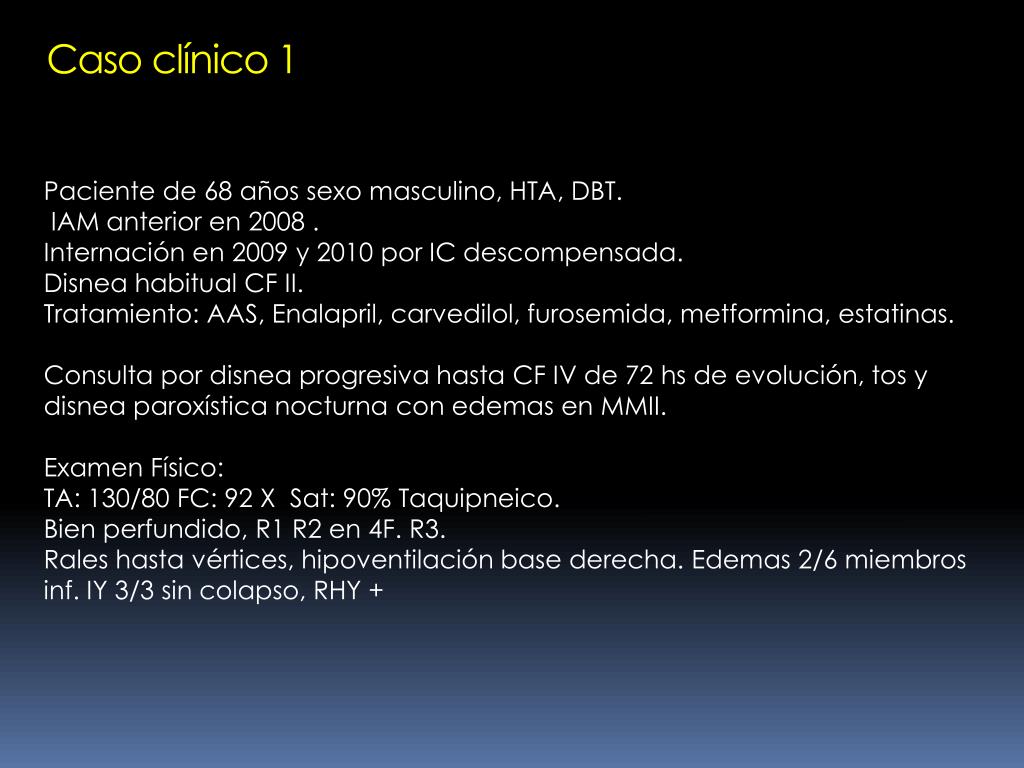 Caso clínico 1 Paciente de 68 años sexo masculino, HTA, DBT. IAM anterior en 2008 . Internación en 2009 y 2010 por IC descompensada. Disnea habitual CF II. Tratamiento: AAS, Enalapril, carvedilol, furosemida, metformina, estatinas. Consulta por disnea progresiva hasta CF IV de 72 hs de evolución, tos y disnea paroxística nocturna con edemas en MMII. Examen Físico: TA: 130/80 FC: 92 X Sat: 90% Taquipneico. Bien perfundido, R1 R2 en 4F. R3. Rales hasta vértices, hipoventilación base derecha. Edemas 2/6 miembros inf. IY 3/3 sin colapso, RHY +