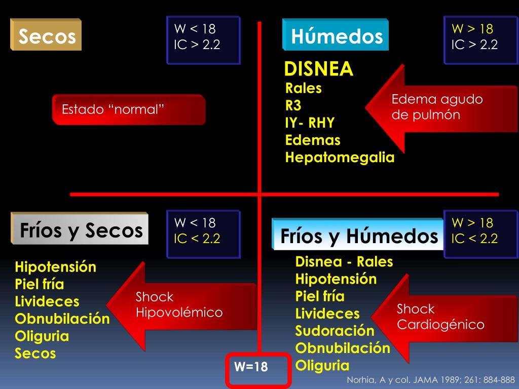 Fríos y Secos W < 18 IC > 2.2 W > 18 IC > 2.2 Secos Húmedos DISNEA Edema agudo de pulmón Rales R3 IY- RHY Edemas Hepatomegalia Estado “normal” W < 18 IC < 2.2 W > 18 IC < 2.2 Fríos y Húmedos Disnea - Rales Hipotensión Piel fría Livideces Sudoración Obnubilación Oliguria Hipotensión Piel fría Livideces Obnubilación Oliguria Secos Shock Hipovolémico Shock Cardiogénico W=18 Norhia, A y col. JAMA 1989; 261: 884-888