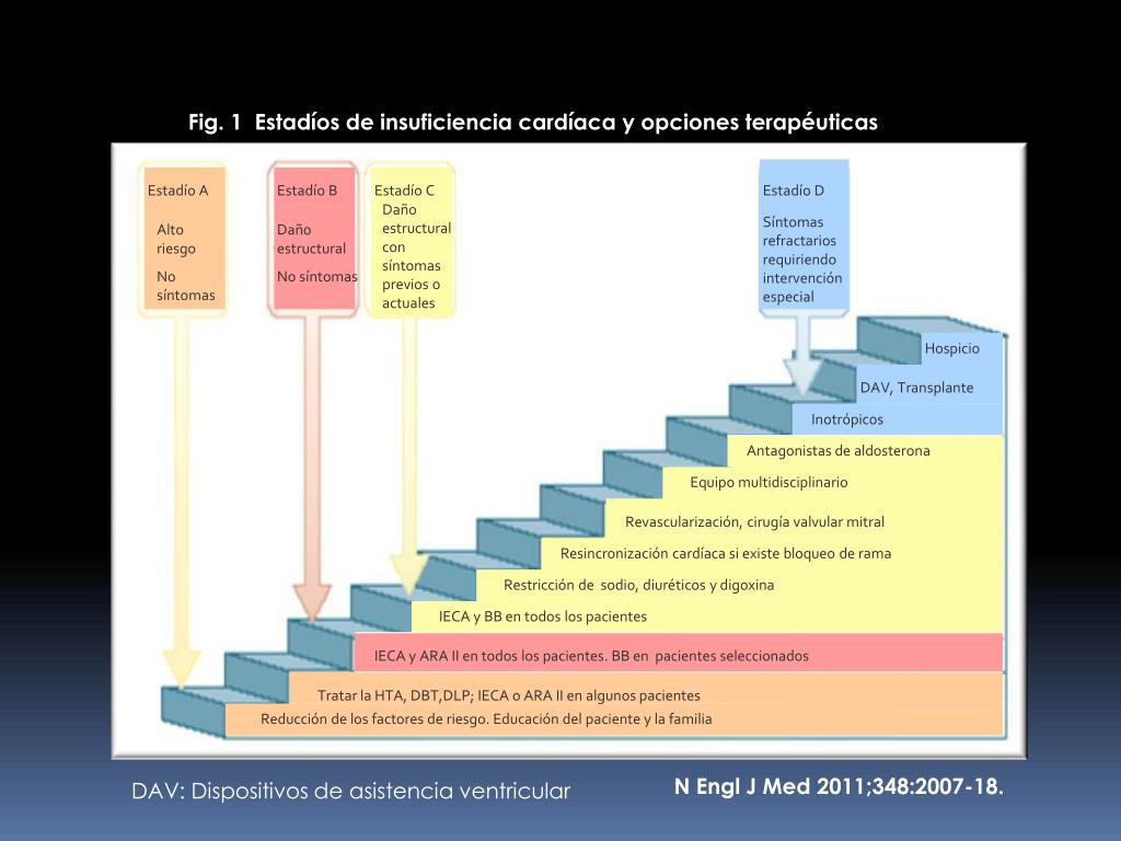 Fig. 1 Estadíos de insuficiencia cardíaca y opciones terapéuticas Estadío A Estadío B Estadío C Estadío D Daño estructural con síntomas previos o actuales Síntomas refractarios requiriendo intervención especial Alto riesgo No síntomas Daño estructural No síntomas Hospicio DAV, Transplante Inotrópicos Antagonistas de aldosterona Equipo multidisciplinario Revascularización, cirugía valvular mitral Resincronización cardíaca si existe bloqueo de rama Restricción de sodio, diuréticos y digoxina IECA y BB en todos los pacientes IECA y ARA II en todos los pacientes. BB en pacientes seleccionados Tratar la HTA, DBT,DLP; IECA o ARA II en algunos pacientes Reducción de los factores de riesgo. Educación del paciente y la familia N Engl J Med 2011;348:2007-18. DAV: Dispositivos de asistencia ventricular