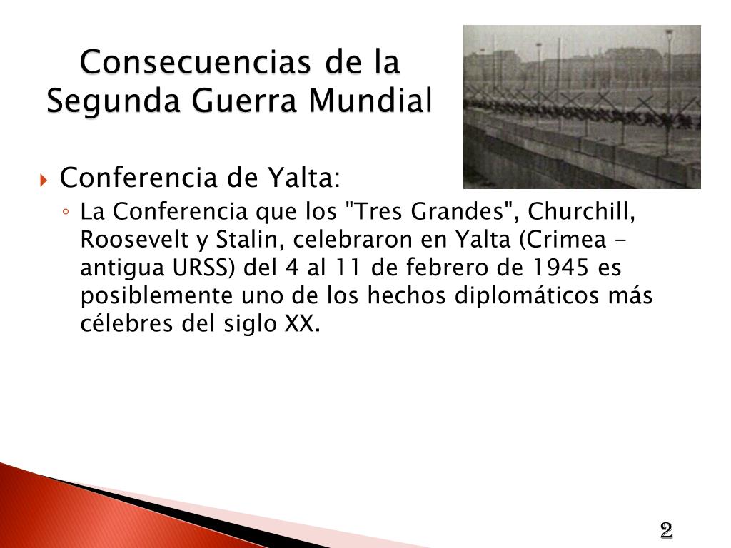 Consecuenciasde la Segunda Guerra Mundial • Conferencia de Yalta: • La Conferencia que los "Tres Grandes", Churchill, Roosevelt y Stalin, celebraron en Yalta (Crimea - antigua URSS) del 4 al 11 de febrero de 1945 es posiblemente uno de los hechos diplomáticos más célebres del siglo XX. 2