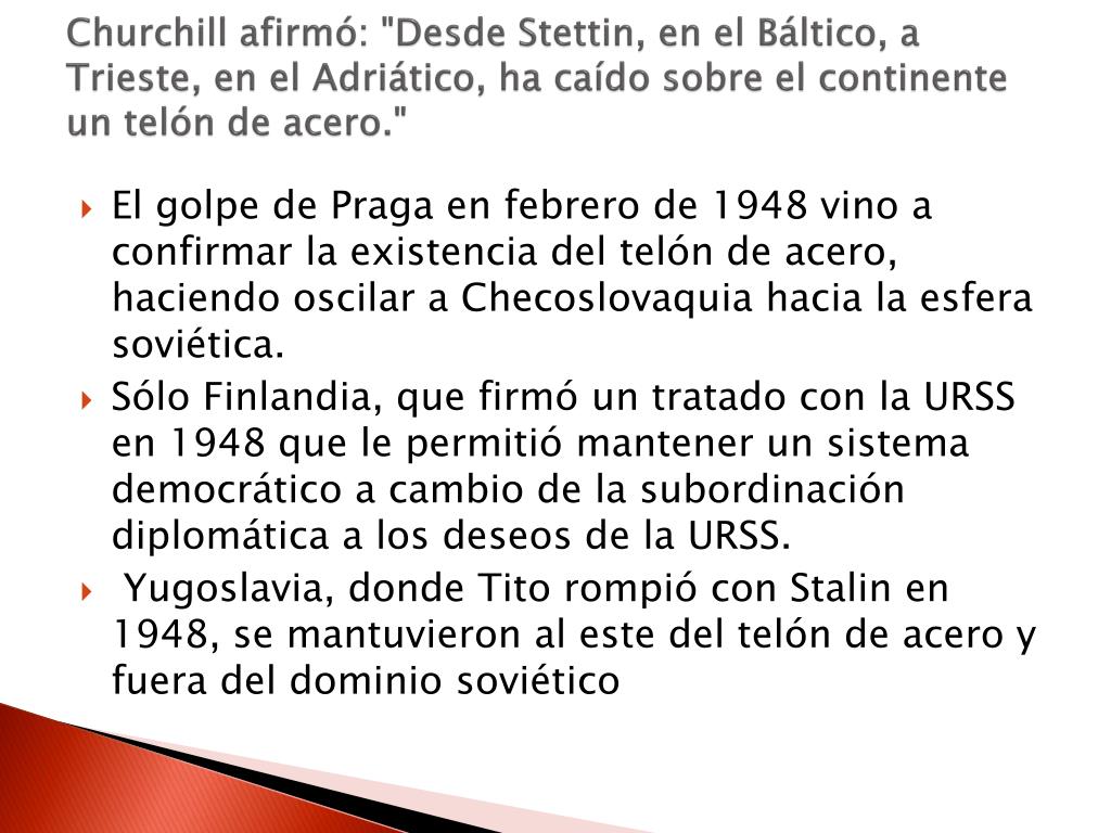 Churchill afirmó: "Desde Stettin, en el Báltico, a Trieste, en el Adriático, ha caído sobre el continente un telón de acero." • El golpe de Praga en febrero de 1948 vino a confirmar la existencia del telón de acero, haciendo oscilar a Checoslovaquia hacia la esfera soviética. • Sólo Finlandia, que firmó un tratado con la URSS en 1948 que le permitió mantener un sistema democrático a cambio de la subordinación diplomática a los deseos de la URSS. • Yugoslavia, donde Tito rompió con Stalin en 1948, se mantuvieron al este del telón de acero y fuera del dominio soviético