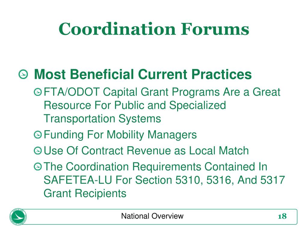 Coordination Forums National Overview • Most Beneficial Current Practices • FTA/ODOT Capital Grant Programs Are a Great Resource For Public and Specialized Transportation Systems • Funding For Mobility Managers • Use Of Contract Revenue as Local Match • The Coordination Requirements Contained In SAFETEA-LU For Section 5310, 5316, And 5317 Grant Recipients
