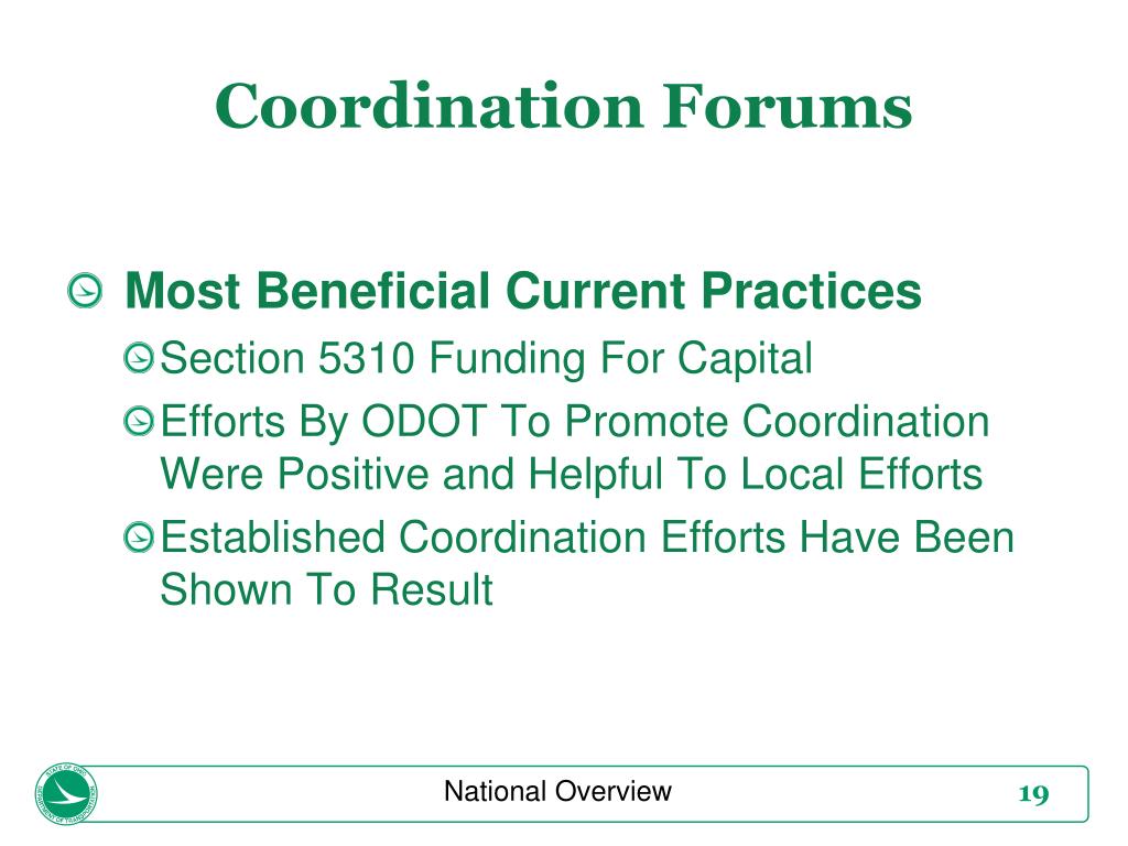 Coordination Forums National Overview • Most Beneficial Current Practices • Section 5310 Funding For Capital • Efforts By ODOT To Promote Coordination Were Positive and Helpful To Local Efforts • Established Coordination Efforts Have Been Shown To Result In Cost Savings
