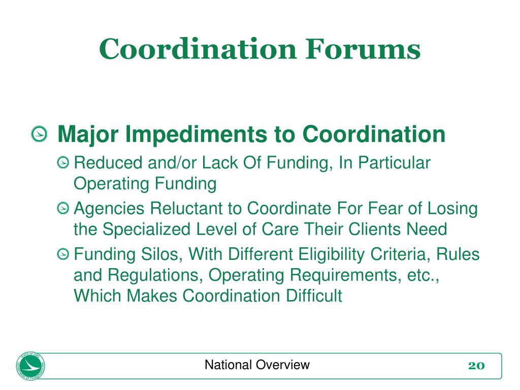 Coordination Forums National Overview • Major Impediments to Coordination • Reduced and/or Lack Of Funding, In Particular Operating Funding • Agencies Reluctant to Coordinate For Fear of Losing the Specialized Level of Care Their Clients Need • Funding Silos, With Different Eligibility Criteria, Rules and Regulations, Operating Requirements, etc., Which Makes Coordination Difficult
